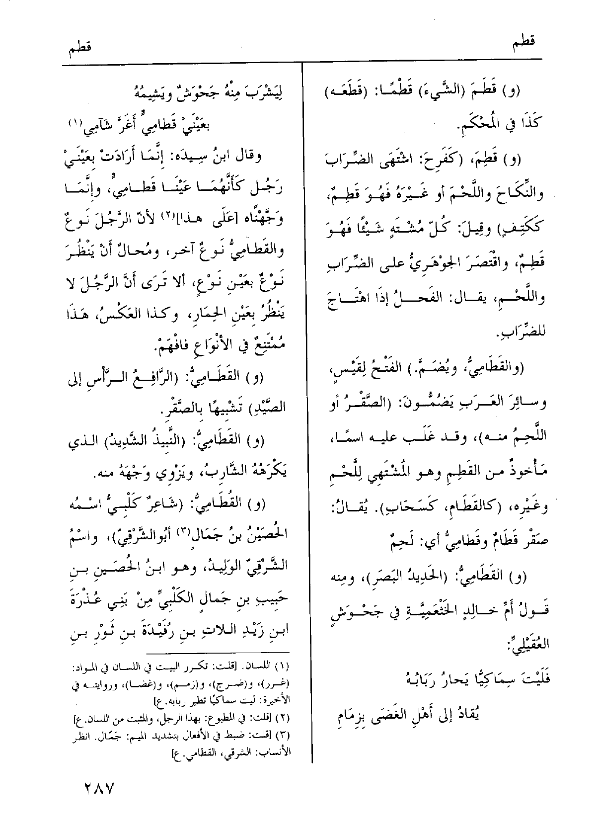 وَقَالَ ابنُ سِيدَه: إِنَّمَا أَرَادَتْ بِعَيْنَيْ رَجُل كَأَنَّهُمَا عَيْنَا قَطامِيٍّ، وإِنَّمَا وَجَّهْنًاه [عَلَى هَذَا] لأنّ الرَّجُلَ نَوعٌ والقَطامِيُّ نَوعٌ آخر، ومُحالٌ أَنْ يَنْظُرَ نَوْعٌ بعَيْنِ نَوْعٍ، أَلا تَرَى أَنَّ الرَّجُلَ لَا يَنْظُرُ بِعَيْنِ الحِمَارِ، وَكَذَا العَكْسُ، هَذَا مُمْتَنِعٌ فِي الأنْوَاعِ فافْهَمْ.