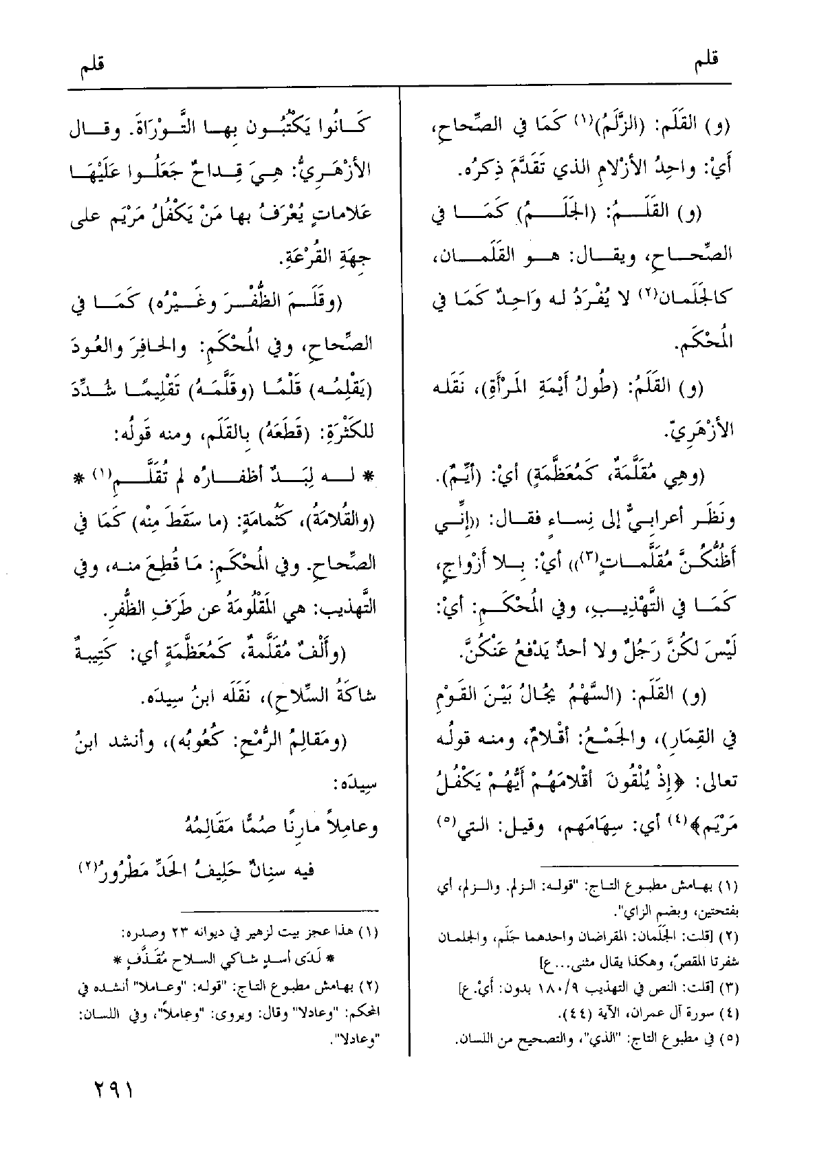 (و) القَلَم: (السَّهْمُ يُجالُ بَيْنَ القَوْمِ فِي القِمَارِ) ، والجَمْعُ: أقْلامٌ، وَمِنْه قولُه تَعَالَى: {إِذْ يلقون أقلامهم أَيهمْ يكفل مَرْيَم} أَي: سِهَامَهم، وَقيل: الَّتِي كَانُوا يَكْتُبُون بِها التَّوْرَاةَ. وَقَالَ الأزْهَرِيُّ: هِيَ قِداحٌ جَعَلُوا عَلَيْهَا عَلاماتٍ يُعْرَفُ بهَا مَنْ يَكْفُلُ مَرْيَم على جِهَةِ القُرْعَةِ.