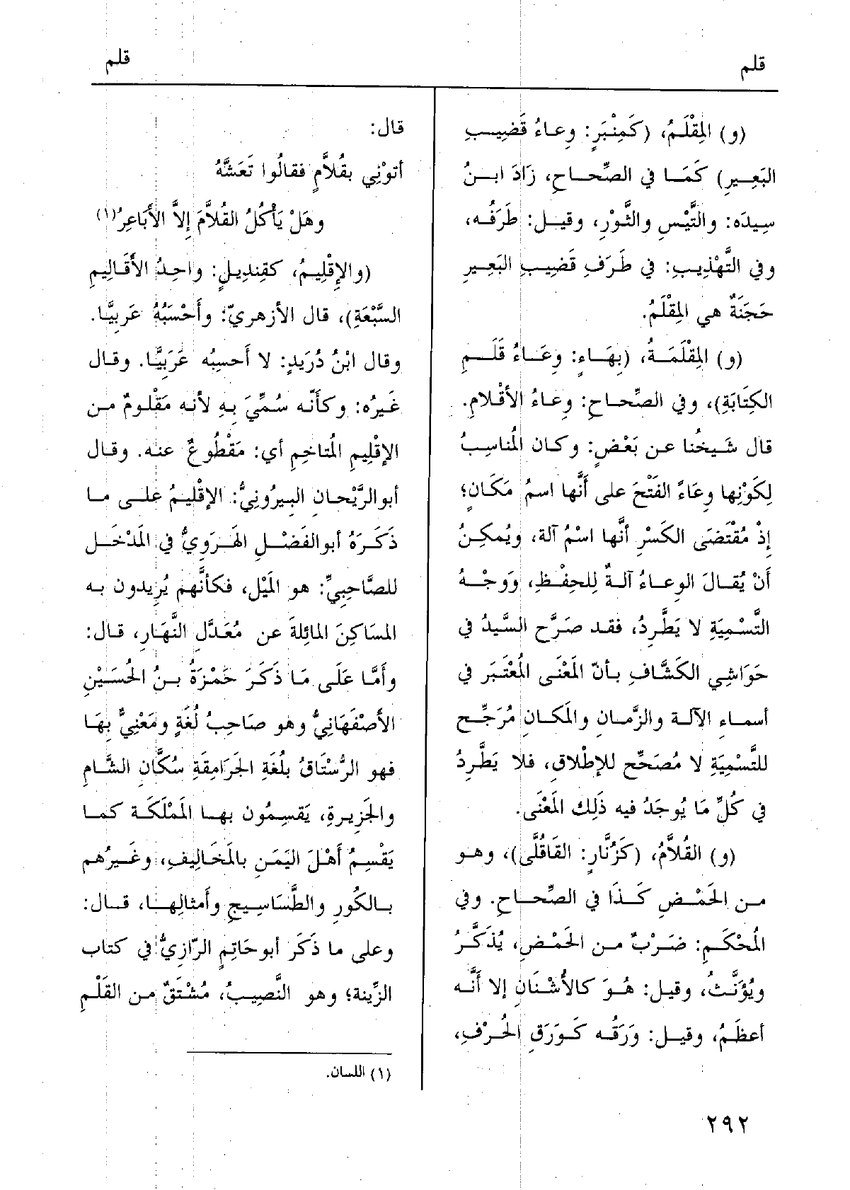 (والإِقْلِيمُ، كقِندِيلٍ: واحِدُ الأَقَالِيمِ السَّبْعَةِ) ، قَالَ الأزهريَ: وأَحْسَبُهُ عَربِيَّا. وَقَالَ ابْنُ دُرَيدٍ: لَا أَحسِبُه عَرَبِيَّا. وَقَالَ غَيرُه: وكأَنّه سُمِّيَ بِهِ لِأَنَّهُ مَقْلومٌ من الإقْلِيمِ المُتاخِمِ أَي: مَقْطُوعٌ عَنهُ. وَقَالَ أَبُو الرَّيْحانِ البِيرُونِيُّ: الإقْليمُ على مَا ذَكَرَهُ أَبُو الفَضْلِ الهَرَوِيُّ فِي المَدْخَل للصَّاحِبِيِّ: هُوَ المَيْل، فكأنَّهم يُرِيدون بِهِ المسَاكِنَ المائِلةَ عَن مُعَدَّلِ النَّهَارِ، قَالَ: وأَمَّا عَلَى مَا ذَكَرَ حَمْزَةُ بنُ الحُسَيْنِ الأَصْفَهَانِيُّ وَهُوَ صَاحِبُ لُغَةٍ ومَعْنِيٌّ بِهَا فَهُوَ الرُّسْتَاقُ بلُغَةِ الجَرَامِقَةِ سُكَّانِ الشَّامِ والجَزِيرةِ، يَقسِمُون بهَا المَمْلَكَة كَمَا يَقْسِمُ أَهْلَ اليَمَنِ بالمَخَالِيفِ، وغَيرُهم بالكُورِ والطَّسَاسِيجِ وأَمثالِها، قَالَ: وعَلى مَا ذَكَر أَبُو حَاتِمٍ الرّازِيُّ فِي كتاب الزِّينة؛ وَهُوَ النَّصِيبُ، مُشْتَقٌ من القَلْمِ