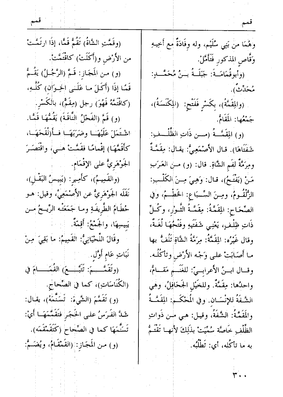(و) } المِقَمَّةُ (من ذَاتِ الظِّلْفِ: شَفَتَاهَا) . قَالَ الأَصْمَعِيُّ: يُقَال: {مِقَمَّةٌ ومِرَمَّةٌ لفَمِ الشَّاةِ. قَالَ: (و) من العَرَبِ مَنْ (يَفْتَحُ) ، قَالَ: وَهِيَ مِنَ الكَلْبِ: الزُّلْقُومُ، ومِنَ السِّبَاعِ: الخَطْمُ، وَفِي الصِّحَاحِ: المِقَمَّةُ: مِقَمَّةُ الثَّوْرِ، وكُلِّ ذَاتِ ظِلْفٍ، يَعْنِي شَفَتَيهِ وفَتْحُهَا لُغَةٌ، وَقَالَ غَيْرُه: المِقَمَّةُ: مِرَمَّةُ الشَّاةِ تَلُفُّ بهَا مَا أَصَابَتْ على وَجْه الأَرْضِ وتأكُلُه. وَقَالَ ابنُ الأَعرابِيّ: للغَنَمِ مَقامُّ، واحدُها: مِقَمَّةٌ. وللخَيْلِ الجَحَافِلُ، وَهِي الشَّفَةُ للإنْسَانِ. وَفِي المُحْكَم:} المِقَمَّةُ {والمَقَمَّةُ: الشَّفَةُ، وَقيل: هِيَ من ذَواتِ الظِّلْفِ خَاصَّة سُمِّيَتْ بذَلِكَ لِأَنَّهَا} تَقْتَمُّ بِهِ مَا تأكُله، أَي: تَطْلُبُه.