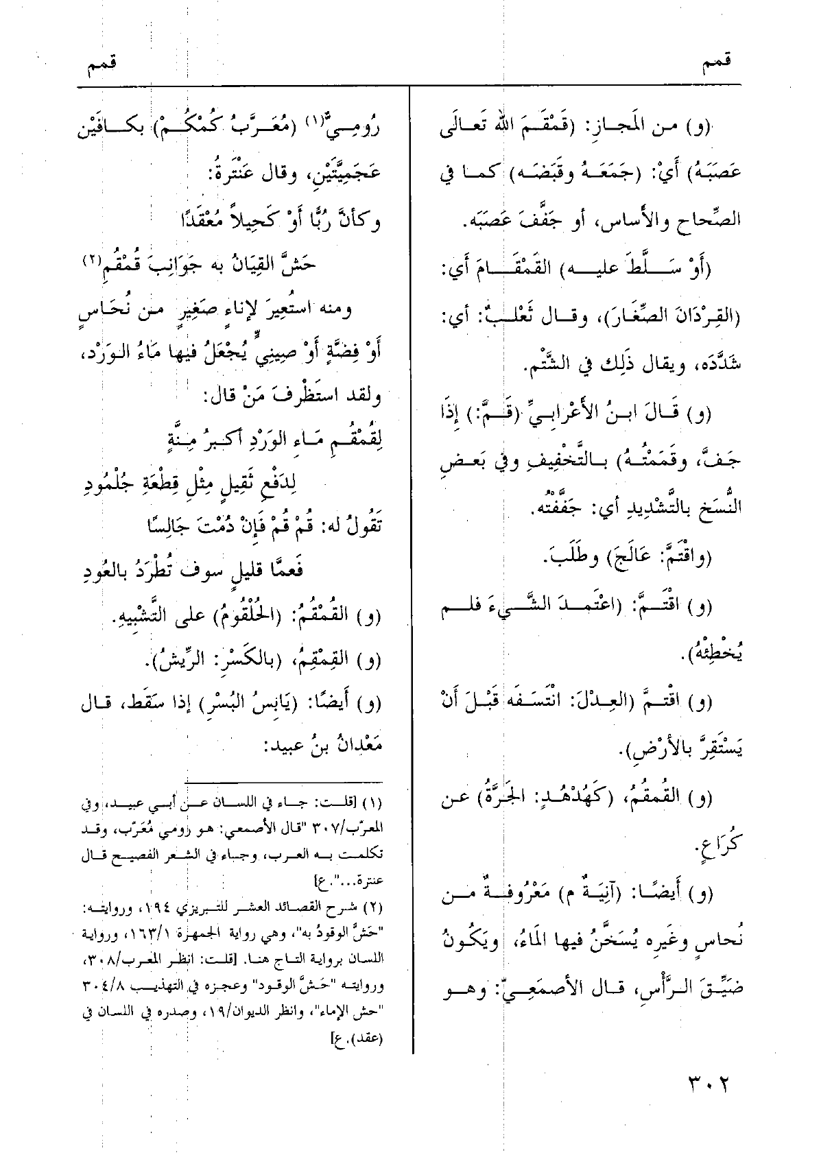 (و) من المَجازِ: ( {قَمْقَمَ الله تَعالَى عَصَبَهُ) أَيْ: (جَمَعَهُ وقَبَضَه) كَمَا فِي الصِّحاح والأَساس، أَو جَفَّفَ عَصَبَه.