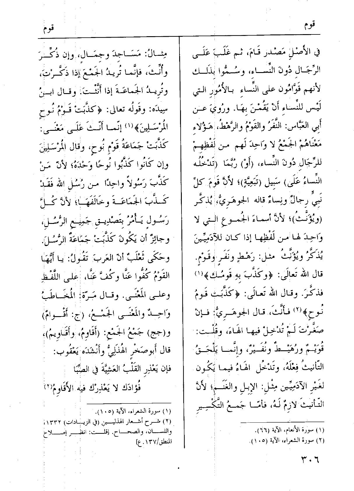 فِي الأَصْلِ مَصْدر {قَامَ، ثمَّ غَلَبَ عَلَى الرَّجَالِ دُونَ النِّساءِ، وسُمُّوا بِذَلك لأَنهم} قَوَّامُون على النِّساءِ بالأُمُورِ الَّتِي لَيْس للنِّساءِ أَنْ {يَقُمْنَ بِهَا. ورُويَ عَن أَبِي العَبَّاس: النَّفَرُ والقَوْمُ والرَّهْطُ، هَؤُلاءِ مَعْنَاهُمْ الجَمْعُ لَا وَاحِدَ لَهم من لَفْظِهِمْ للرِّجَالِ دُونَ النِّساء، (أَوْ) رُبَّمَا (تَدْخُلُه النِّساءُ علَى) سَبِيل (تَبَعِيَّةٍ) ؛ لأنَّ قَومَ كلِّ نَبِيٍّ رِجالٌ ونِساءٌ قَالَه الجوهَرِيُّ، يُذكَّر (ويُؤَنَّثُ) ؛ لأنَّ أسماءَ الجُموعِ الَّتِي لَا وَاحِد لَهَا من لَفْظِها إِذا كَانَ للآدَمِيِّينَ يُذَكَّرُ ويُؤَنَّثُ مثل: رَهْطٍ ونَفَرٍ وقَوْمٍ. قَالَ الله تَعالَى: {وَكذب بِهِ} قَوْمك} فذكَّرَ. وَقَالَ الله تَعالَى: {كذبت قوم نوح} فأَنَّثَ، قَالَ الجوهَرِيُّ: فإنْ صَغَّرْتَ لَمْ تُدْخِلْ فِيهَا الهَاءَ، وقُلْت: {قُوَيْمٌ ورُهَيْطٌ ونُفَيْرٌ، وإِنَّما يَلْحَقُ التّانيثُ فِعْلَهُ، وتَدْخُل الهَاءُ فِيمَا يَكُون لغَيْرِ الآدَمِيِّين مِثْلِ: الإِبِلِ والغَنَمِ؛ لأَنَّ التّأنيثَ لازِمٌ لَهُ، فأمّا جَمعُ التَّكْسِيرِ مِثالُ: مَسَاجِدَ وجِمَالٍ، وَإِن ذُكِّرَ وأُنِّثَ، فإنَّما تُريدُ الجَمْعَ إِذا ذَكَّرْتَ، وتُرِيدُ الجَماعَةَ إِذا أَنَّثْتَ. وَقَالَ ابنُ سِيدَه: وقَولُه تَعَالَى: {كذبت قوم نوح الْمُرْسلين} إنّما أَنّثَ عَلَى مَعْنَى: كَذَّبَتْ جَمَاعَةُ قَوْمِ نُوحٍ، وَقَالَ المُرْسَلِينَ وَإِن كَأنُوا كَذَّبُوا نُوحًا وَحْدَهُ؛ لأنّ مَنْ كَذَّبَ رَسُولاً واحِدًا من رُسُلِ الله فَقَدْ كَذَّبَ الجَمَاعَةَ وخَالَفَهَا؛ لأنَّ كُلَّ رَسُولٍ يَأْمُرُ بِتَصْدِيقِ جَمِيعِ الرُّسُلِ، وجائِزٌ أَن يَكُونَ كَذَّبَتْ جَمَاعَةٌ الرُّسُلَ. وحَكَى ثَعْلَبٌ أنّ العَربَ تَقُولُ: يَا أَيُّهَا القَوْمُ كُفُّوا عَنَّا وكُفَّ عَنَّا، على اللَّفْظِ وعَلى المَعْنَى. وَقَالَ مَرّة: المُخَاطَبُ وَاحِدٌ والمَعْنَى الجَمْعُ، (ج:} أَقْوامٌ) و (جج) جَمْعُ الجَمْعِ: ( {أَقَاوِمُ،} وأَقَاوِيمُ) ، قَالَ أَبو صَخْرٍ الهُذَلِيُّ وأَنْشَدَه يَعْقُوب: