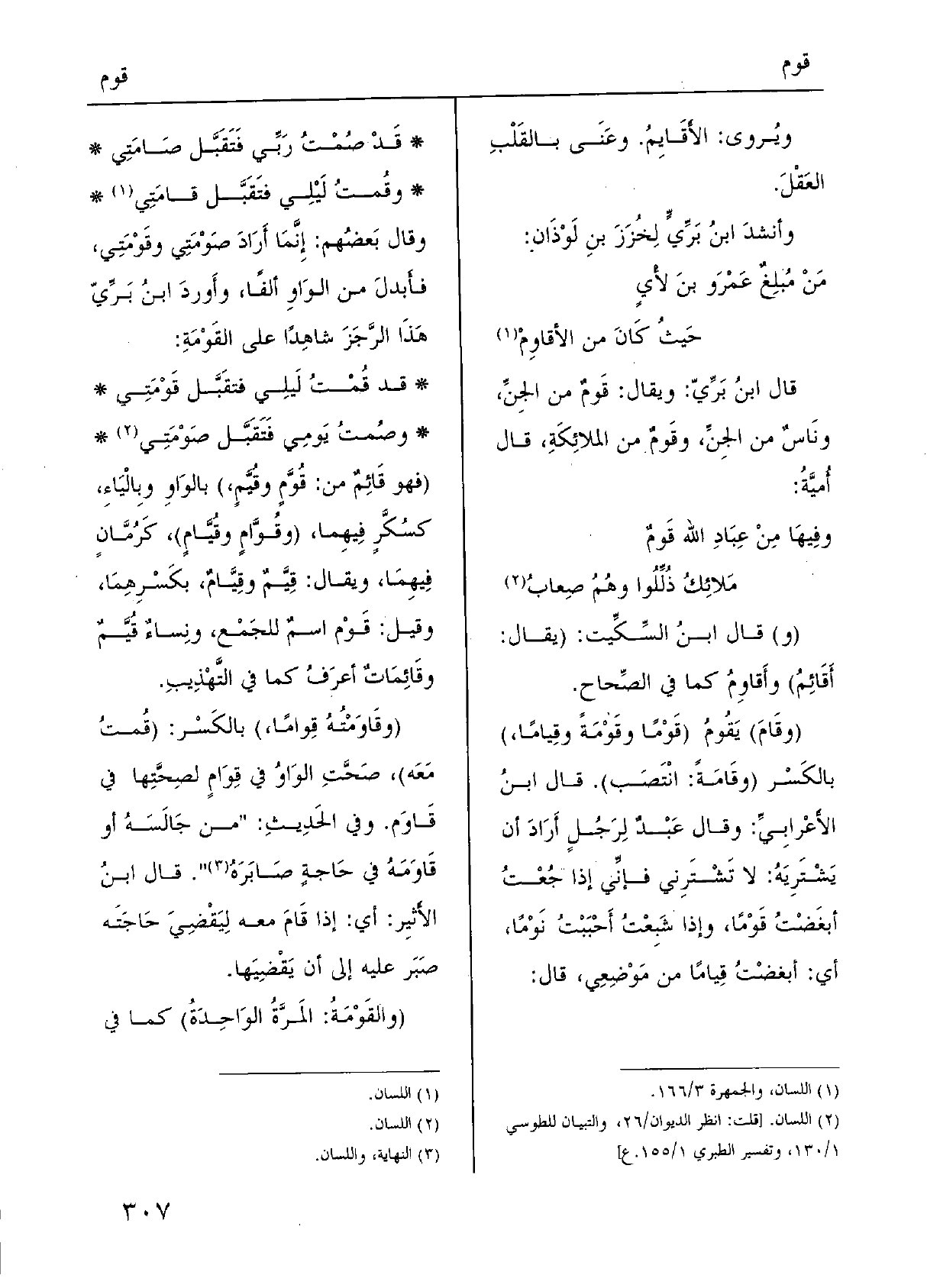 وَقَالَ بَعضُهم: إِنَّمَا أَرَادَ صَوْمَتِي} وقَوْمَتِي، فأَبدلَ من الوَاوِ ألفا، وأَوردَ ابنُ بَرِّيّ هَذَا الرَّجَزَ شاهِدًا على القَوْمَةِ: