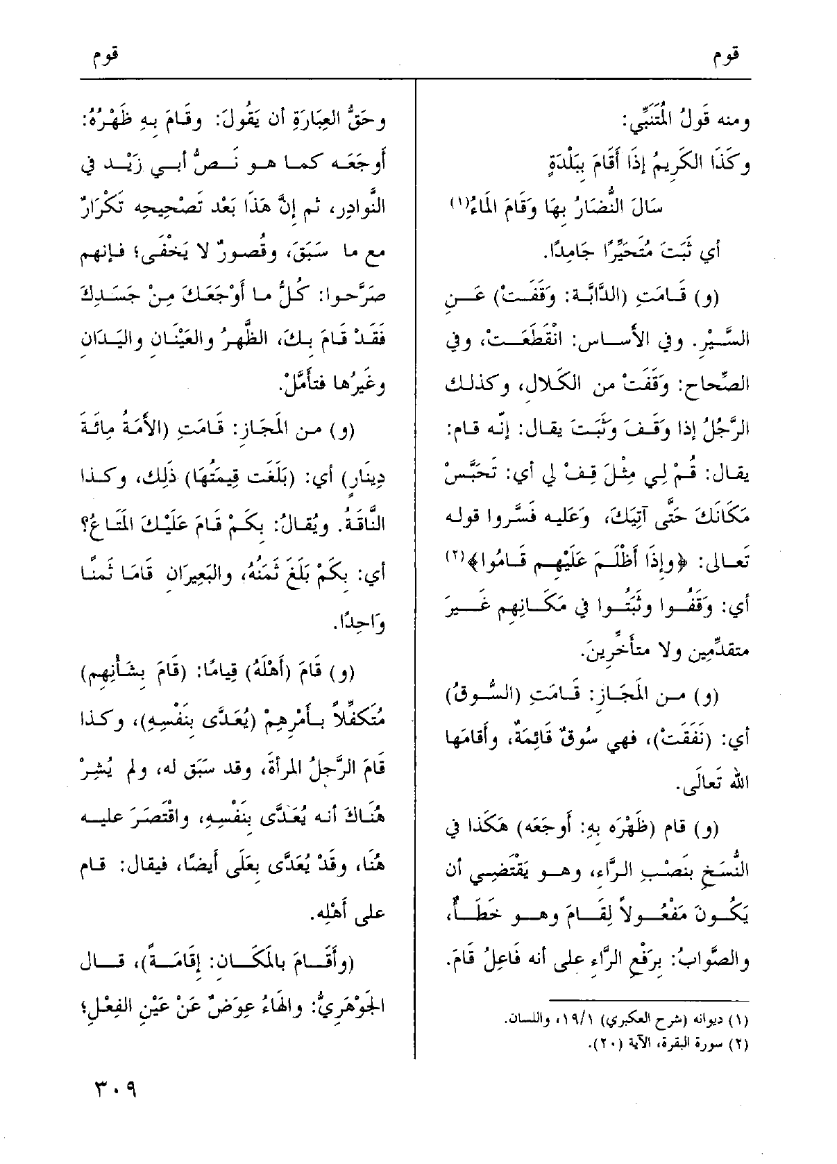 (و) } قَامَتِ (الدَّابَّة: وَقَفَتْ) عَنِ السَّيْرِ. وَفِي الأَساس: انْقَطَعَتْ، وَفِي الصِّحاح: وَقَفَتْ من الكَلالِ، وَكَذَلِكَ الرَّجُلُ إِذا وَقَفَ وَثَبَتَ يُقَال: إنّه قَامَ: يُقَال: {قُمْ لِي مِثْلَ قِفْ لي أَي: تَحَبَّسْ مَكَانَكَ حَتَّى آتِيَكَ، وَعَليه فَسَّروا قَوْله تَعالى: {وَإِذا أظلم عَلَيْهِم} قَامُوا} أَي: وَقَفُوا وثَبَتُوا فِي مَكَانِهم غَيرَ متقدِّمِين وَلَا متأَخِّرِينَ.