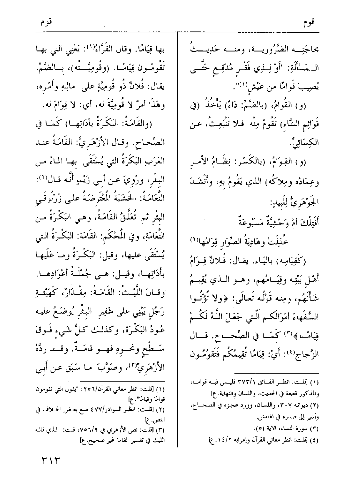 (و) } القِوَامُ، (بالكَسْر: نِظَامُ الأمرِ وعِمَادُه ومِلاكُه) الَّذِي {يَقُومُ بِهِ، وأَنْشَدَ الجَوْهَرِيُّ لِلَبِيدٍ: