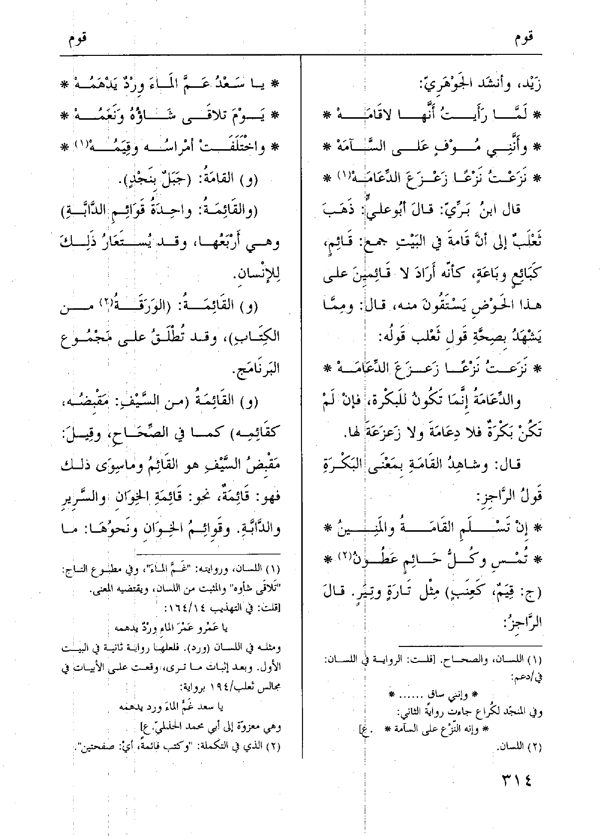 قَالَ ابنُ بَرِّيّ: قالَ أبُو عليٍّ: ذَهَبَ ثَعْلَبٌ إِلَى أنَّ قَامةَ فِي البَيْتِ جمع:} قَائِمٍ، كَبَائِعٍ وبَاعَةٍ، كأنّه أَرَادَ لَا {قَائِمِينَ على هَذَا الحَوْضِ يَسْتَقُونَ مِنْهُ، قَالَ: ومِمَّا يَشْهَدُ بِصِحَّةِ قَولِ ثَعْلب قَولُه: