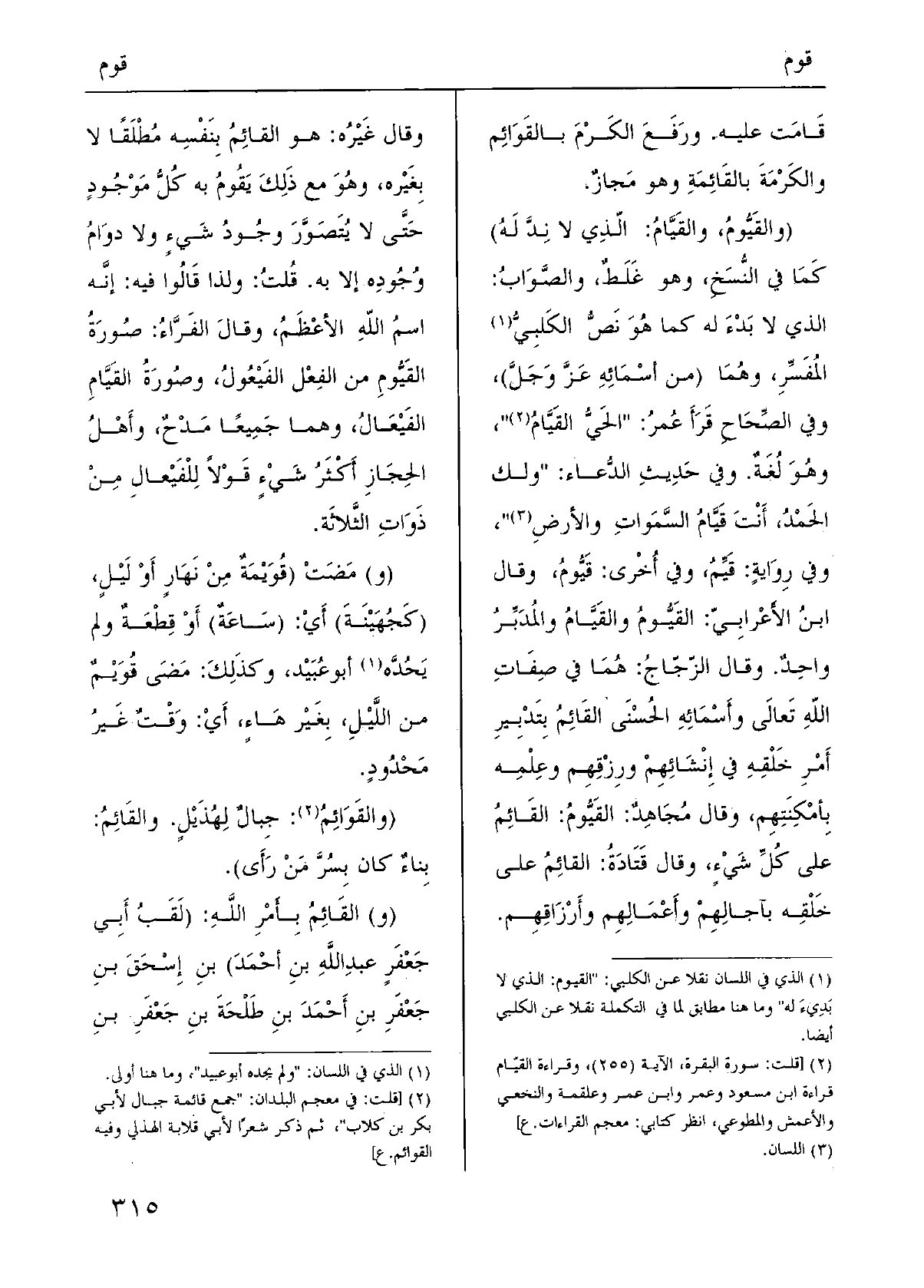 ( {والقَيُّومُ،} والقَيَّامُ: الّذِي لَا نِدَّ لَهُ) كَمَا فِي النُّسَخِ، وَهُوَ غَلَطٌ، والصَّوَابُ: الَّذِي لَا بَدْءَ لَهُ كَمَا هُوَ نَصُّ الكَلبِيُّ المُفَسِّرِ، وهُمَا (من أسْمَائِهِ عَزَّ وَجَلَّ) ، وَفِي الصِّحَاحِ قَرَأَ عُمرُ: " الحَيُّ {القَيَّامُ "، وهُوَ لُغَةٌ. وَفِي حَدِيثِ الدُّعاء " " وَلَك الحَمْدُ، أَنْتَ} قيَّامُ السَّمَواتِ والأرضِ "، وَفِي رِوَايةٍ: {قَيِّمُ، وَفِي أُخْرى:} قَيُّومُ، وَقَالَ ابنُ الأَعْرابِيّ: {القَيُّومُ} والقَيَّامُ والمُدَبِّرُ واحِدٌ. وَقَالَ الزّجّاجُ: هُمَا فِي صِفَاتِ اللهِ تَعالَى وأَسْمَائِهِ الحُسْنَى القَائِمُ بِتَدْبِيرِ أَمْرِ خَلْقِهِ فِي إِنْشَائِهِمْ، ورِزْقِهِم وعِلْمِه بِأمْكِنَتِهِم، وَقَالَ مُجَاهِدٌ: {القَيُّومُ:} القَائِمُ على كُلِّ شَيْءٍ، وَقَالَ قَتَادَةُ: القائِمُ على خَلْقِه بآجالِهِمْ وأَعْمَالِهِم وأَرْزَاقِهِم. وَقَالَ غَيْرُه: هُوَ {القائِمُ بِنَفْسِه مُطْلَقًا لَا بِغَيْره، وهُوَ مَعَ ذَلِكَ يَقُومُ بِهِ كُلُّ مَوْجُودٍ حَتَّى لَا يُتَصَوَّرَ وجُودُ شَيءٍ وَلَا دوَامُ وُجُودِه إِلَّا بِهِ. قُلتُ: وَلذَا قَالُوا فِيهِ: إنَّه اسمُ اللهِ الأعْظَمُ، وقالَ الفَرَّاءُ: صُورَةُ} القَيُّومِ من الفِعْل الفَيْعُولُ، وصُورَةُ {القَيَّامِ الفَيْعَالُ، وهما جَمِيعًا مَدْحٌ، وأَهْلُ الحِجَازِ أَكْثَرُ شَيْءٍ قَوْلاً لِلْفَيْعالِ مِنْ ذَوَاتِ الثَّلاثَة.