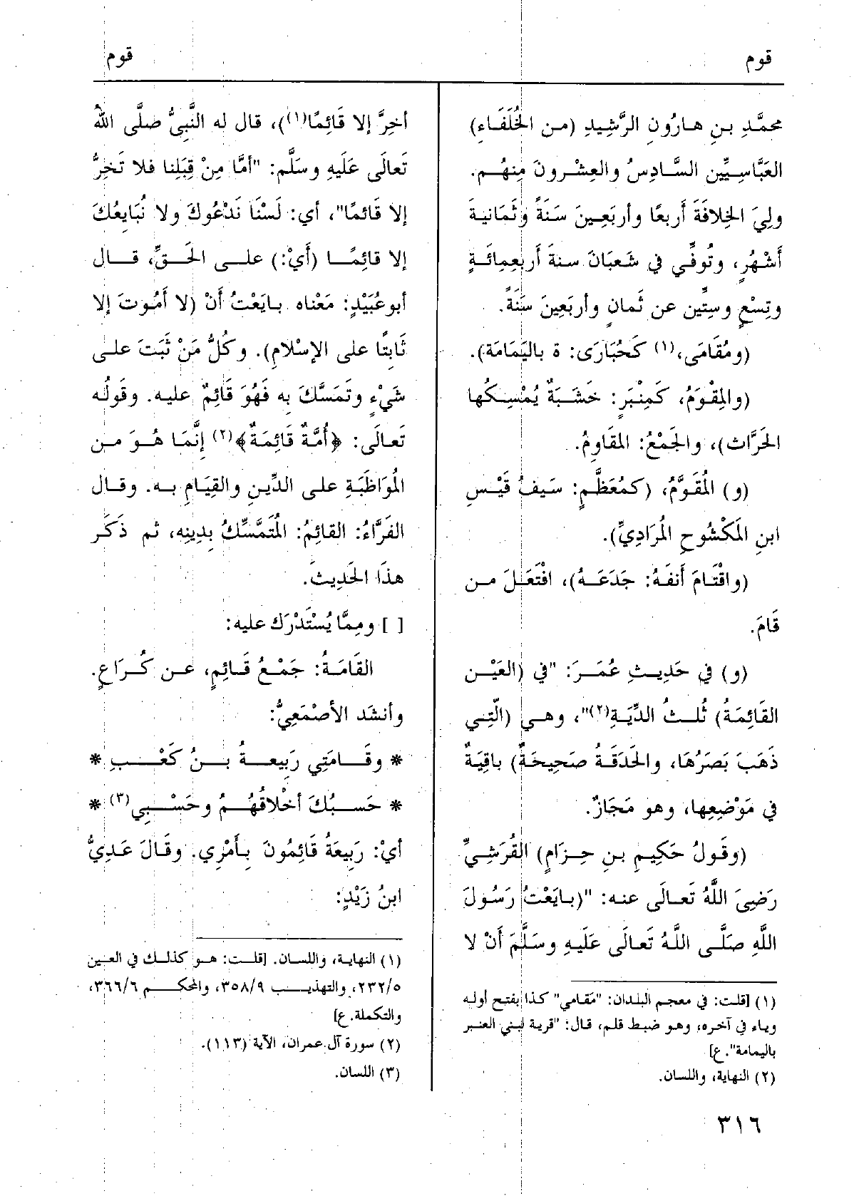 (وقَولُ حَكِيمِ بنِ حِزَامٍ) القُرَشِيِّ رَضِيَ اللَّهُ تَعالَى عَنهُ: " (بايَعْتُ رَسُولَ اللَّهِ صَلَّى اللَّهُ تَعالَى عَلَيه، وسَلَّمَ أَنْ لَا أخِرَّ إِلَّا {قَائِمًا) ، قَالَ لَهُ النَّبِيُّ صلَّى الله تَعالَى عَلَيهِ وسَلَّم: " أمَّا مِنْ قِبَلِنا فَلَا تَخِرُّ إِلَّا قَائمًا "، أَي: لَسْنَا نَدْعُوكَ وَلَا نُبَايِعُكَ إِلَّا قائِمًا (أَيْ:) على الحَقِّ، قَالَ أَبُو عُبَيْدٍ: مَعْناه بايَعْتُ أَنْ (لَا أَمُوتَ إِلَّا ثَابِتًا على الإسْلامِ) . وكُلُّ مَنْ ثَبَتَ على شَيْءٍ وتَمَسَّكَ بِه فَهُوَ قَائِمٌ عَلَيْهِ. وقَولُه تَعالَى: {أمة} قَائِمَة} إِنَّمَا هُوَ من المُوَاظَبَةِ على الدِّينِ والقِيَامِ بِهِ. وَقَالَ الفَرَّاءُ: القائِمُ: المُتَمَّسِّكُ بِدِينه، ثمَّ ذَكَر هذَا الحَدِيثَ. [] ومِمَّا يُسْتَدْرَك عَلَيْهِ: