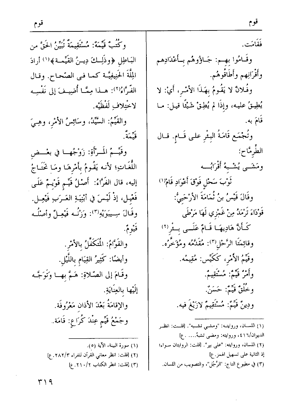 } وقَيِّمُ المَرْأَةِ: زَوْجُها فِي بعْضِ اللُّغَاتِ؛ لِأَنَّهُ {يَقُومُ بِأَمْرِهَا ومَا تَحتَاجُ إِلَيْهِ، قَالَ الفَرَّاءُ: أَصْلُ} قَيِّمٍ {قَوْيِمٌ عَلَى فَعْيِل، إذْ لَيْسَ فِي أبْنِيَةِ العَرَبِ فَيْعِل. وقَالَ سِيبَوَيْهِ: وَزْنُه فَيْعِلٌ وأصْلُه قَيْوِمٌ.