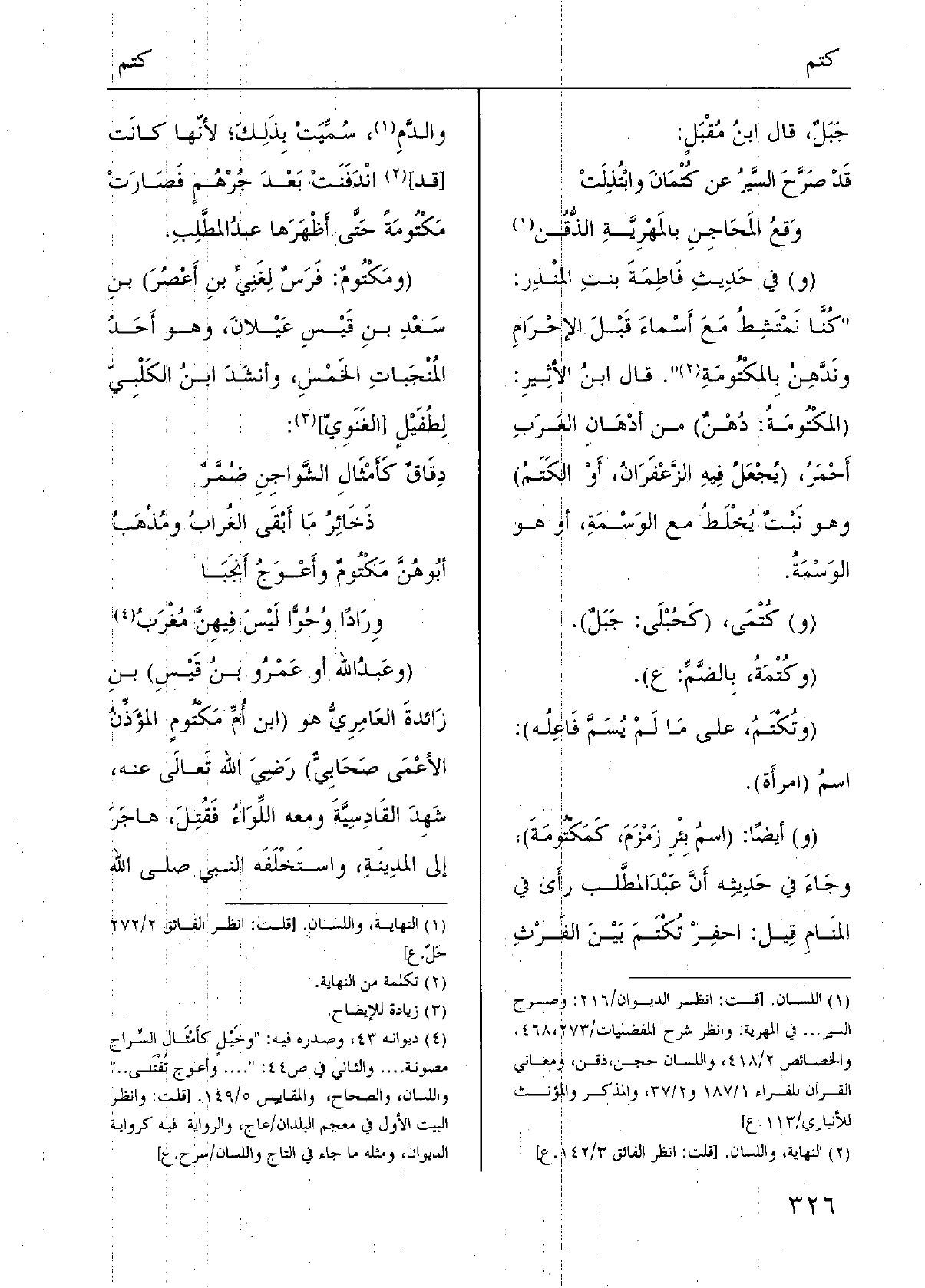 (ومَكْتُومٌ: فَرَسٌ لِغَنِيِّ بنِ أَعْصُرَ) بنِ سَعْدِ بنِ قَيْسِ عَيْلانَ، وَهُوَ أَحَدُ المُنْجَباتِ الخَمْسِ، وأنشَدَ ابنُ الكَلْبِيّ لِطُفَيْلٍ [الغَنَوِيّ] :