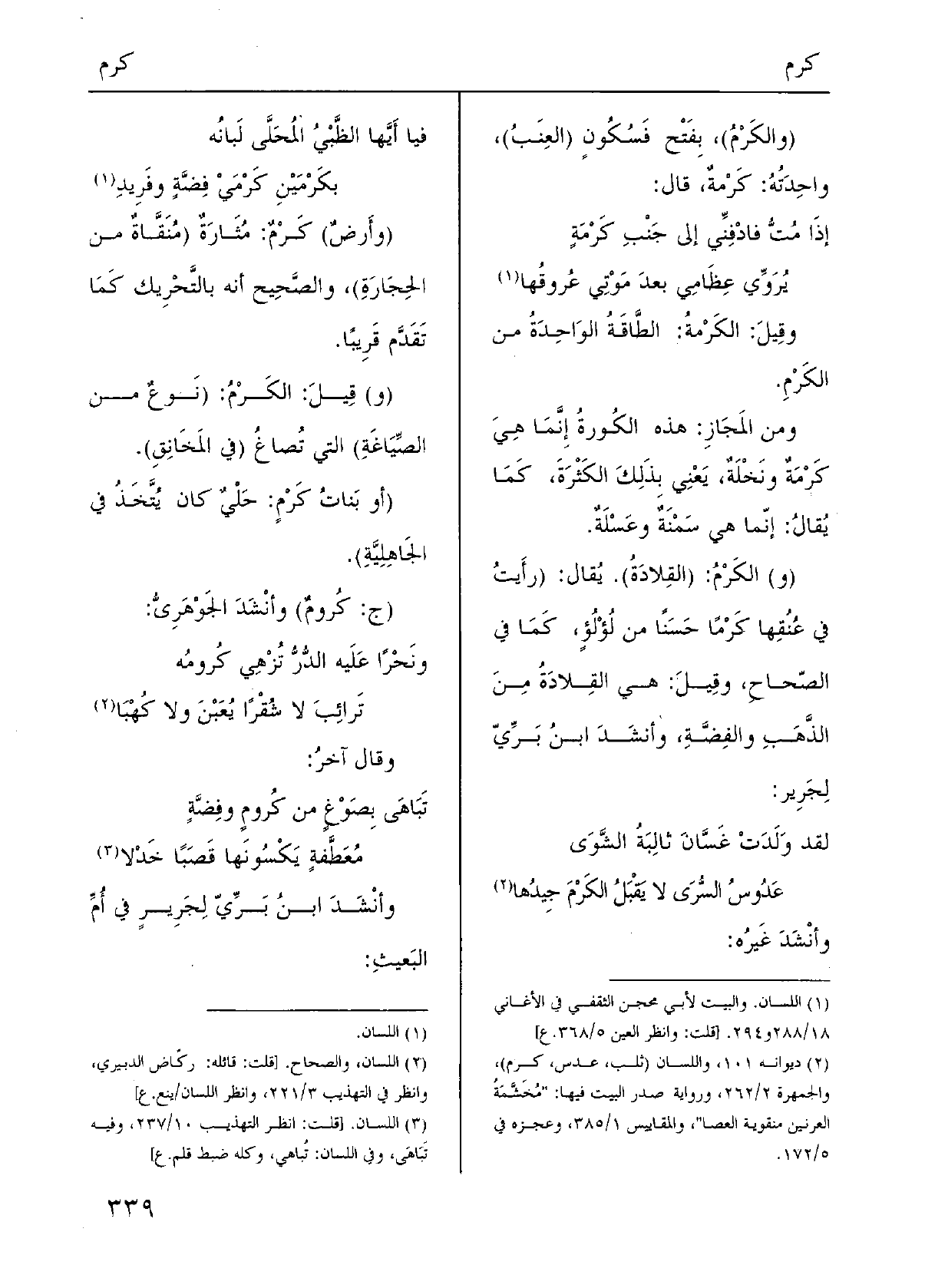 (ج: كُرومٌ) وأنْشَدَ الجَوْهَرِيُّ.
