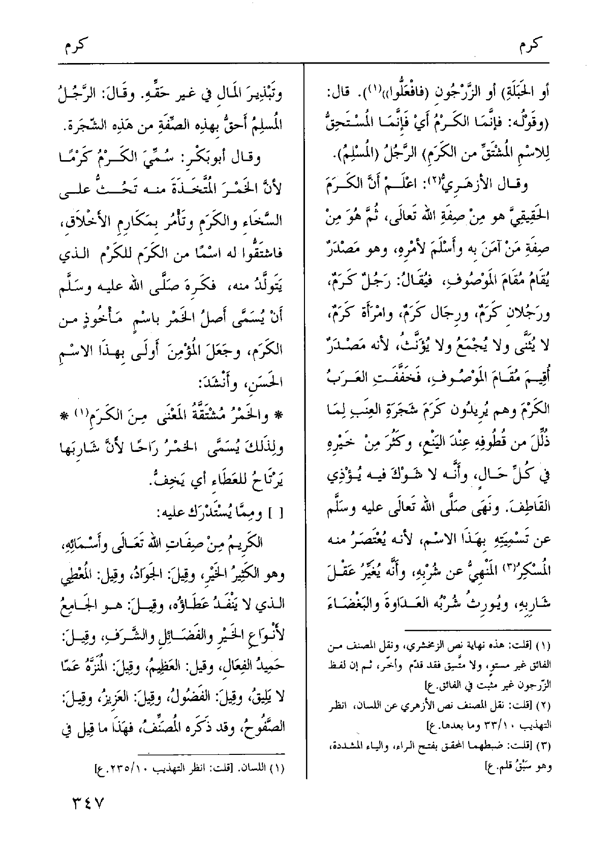 وَقَالَ الأزهَرِيُّ: اعْلَمْ أَنَّ الكَرَمَ الحَقِيقِيَّ هُوَ مِنْ صِفَةِ الله تَعالَى، ثُمَّ هُوَ مِنْ صِفَةِ مَنْ آمَنَ بِه وأَسْلَمَ لأمْرِهِ، وَهُوَ مَصْدَرٌ يُقَامُ مُقَامَ المَوْصُوفِ، فيُقَالُ: رَجُلٌ كَرَمٌ، ورَجُلانِ كَرَمٌ، ورِجَال كَرَمٌ، وامْرَأَة كَرَمٌ، لَا يُثَنَّى وَلَا يُجْمَعُ وَلَا يُؤَنَّثُ، لِأَنَّهُ مَصْدَرٌ أُقِيمَ مُقَامَ المَوْصُوفِ، فَخَفَّفَتِ العَرَبُ الكَرْمَ وهم يُرِيدُون كَرَمَ شَجَرَةِ العِنَبِ لِمَا ذُلِّلَ من قُطُوفِهِ عِنْدَ اليَنْعِ، وكَثُرَ مِنْ خَيْرِهِ القَاطِفَ. ونَهَى صَلَّى الله تَعالَى عَلَيْهِ وسَلَّم عَن تَسْمِيَتِهِ بِهَذَا الاسْم، لِأَنَّهُ يُعْتَصَرُ مِنْهُ المُسْكِرُ المَنْهِيُّ عَن شُرْبِهِ، وأَنَّه يُغَيِّرُ عَقْلَ شَارِبِهِ، ويُورِثُ شُرْبُه العَدَاوةَ والبَغْضَاءَ وتَبْذِيرَ المَالِ فِي غير حَقِّهِ. وقَالَ: الرَّجُلُ المُسلِمُ أَحقُّ بِهذِه الصِّفَةِ من هَذِه الشّجَرة.