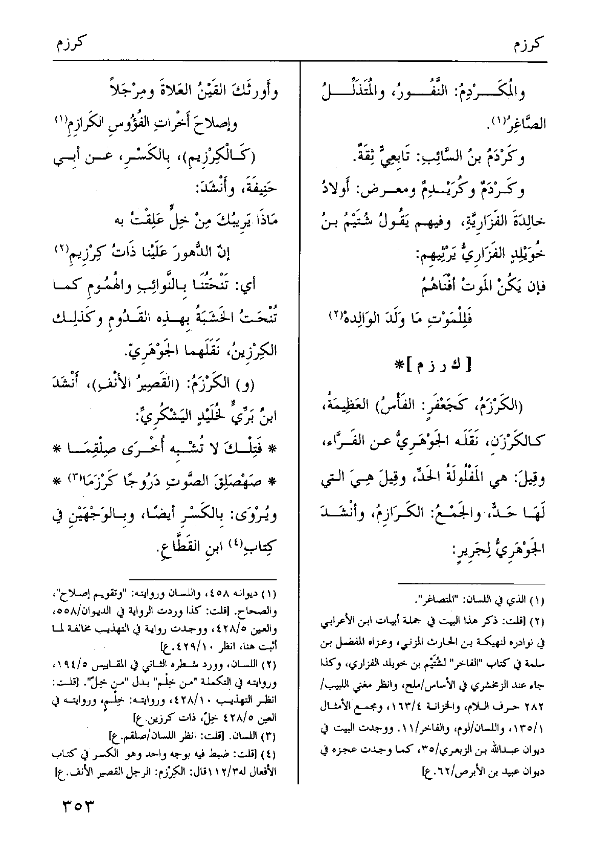 (و) الكَرْزَمُ: (القَصِيرُ الأنْفِ) ، أَنْشَدَ ابنُ بَرِّيٍّ لخُلَيْدٍ اليَشْكُرِيِّ: