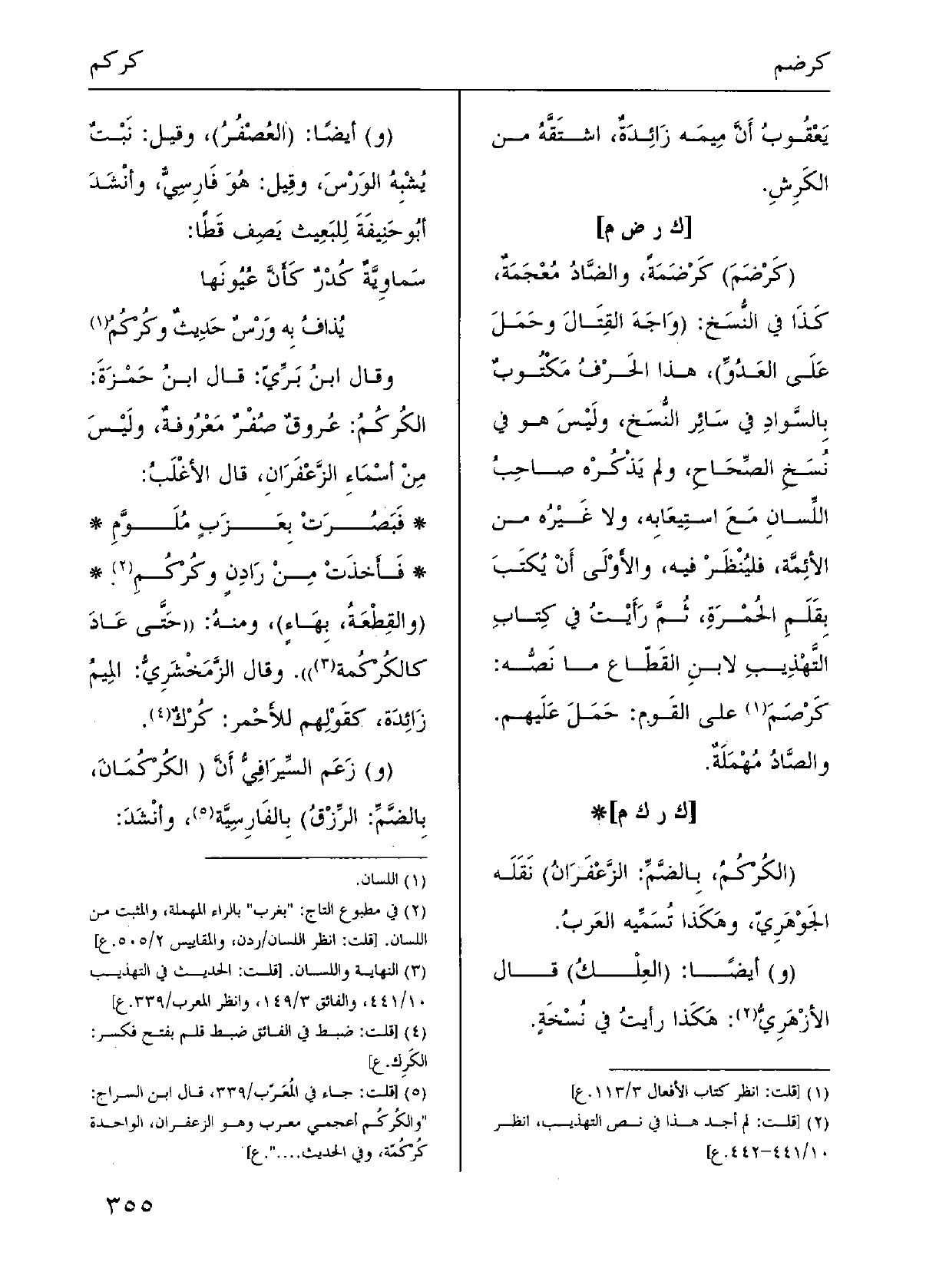 وَقَالَ ابنُ بَرِّيّ: قَالَ ابنُ حَمْزَةَ: الكُركُمُ: عُروقٌ صُفْرٌ مَعْرُوفةٌ، ولَيْسَ مِنْ اسْمَاءِ الزَّعْفَرَانِ، قَالَ الأغْلَبُ: