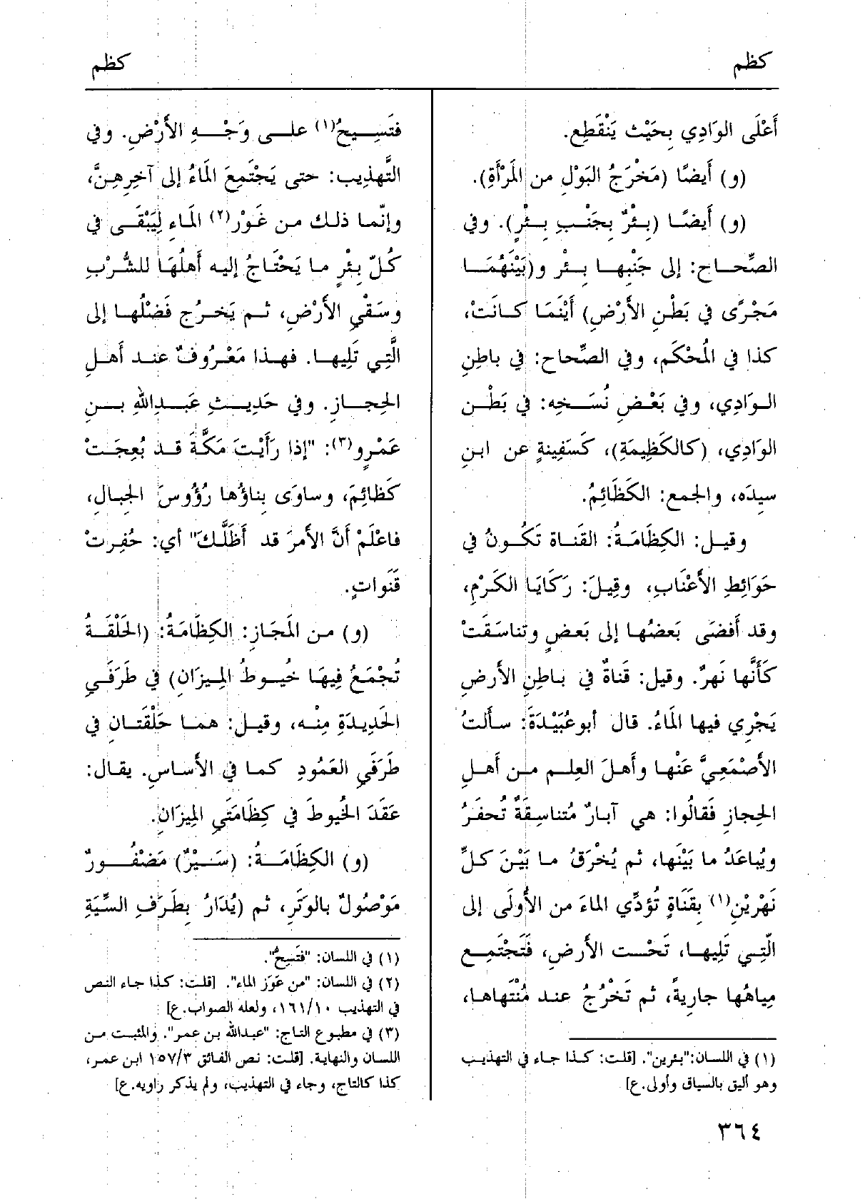 وَقيل: الكِظَامَةُ: القَناة تَكُونُ فِي حَوَائِطِ الأَعْنَابِ، وقِيلَ: رَكَايَا الكَرْمِ، وَقد أَفضَى بَعضُها إِلَى بَعضٍ وتناسَقَتْ كَأَنَّها نَهرٌ. وَقيل: قَناةٌ فِي باطِنِ الأَرضِ يَجْرِي فِيهَا المَاءُ. قَالَ أَبُو عُبَيْدَةَ: سأَلتُ الأَصْمَعِيَّ عَنْها وأَهلَ العِلم من أَهلِ الحِجازِ فَقالُوا: هِيَ آبارٌ مُتناسِقَةٌ تُحفَرُ ويُباعَدُ مَا بَيْنَها، ثمَّ يُخْرَقُ مَا بَيْنَ كلِّ نَهْريْنِ بِقَنَاةٍ تُؤدِّي الماءَ من الأُولَى إِلَى الّتِي تَلِيها، تَحْت الأَرضِ، فَتَجْتَمِع مِياهُها جارِيةً، ثمَّ تَخْرُجُ عِنْد مُنْتَهاها، فتَسِيحُ على وَجْهِ الأَرْضِ. وَفِي التَّهذِيب: حَتَّى يَجْتَمِعَ المَاءُ إِلَى آخِرِهِنَّ، وإنّما ذَلِك من غَوْر المَاءِ لِيَبْقَى فِي كُلّ بِئْرٍ مَا يَحْتَاجُ إِلَيْهِ أَهلُهَا للشُّرْبِ وسَقْيِ الأَرْضِ، ثمَّ يَخرُج فَضْلُها إِلَى الَّتِي تَلِيها. فَهَذَا مَعْرُوفٌ عِنْد أَهلِ الحِجازِ. وَفِي حَدِيثِ عَبدِ اللهِ بنِ عَمْرٍ و: " إِذا رَأَيْتَ مَكَّةَ قد بُعِجَتْ كَظائِمَ، وساوَى بِناؤُها رُؤُوسَ الجِبالِ، فاعْلَمْ أَنَّ الأَمرَ قد أَظَلَّكَ " أَي: حُفِرتْ قَنَواتٍ.