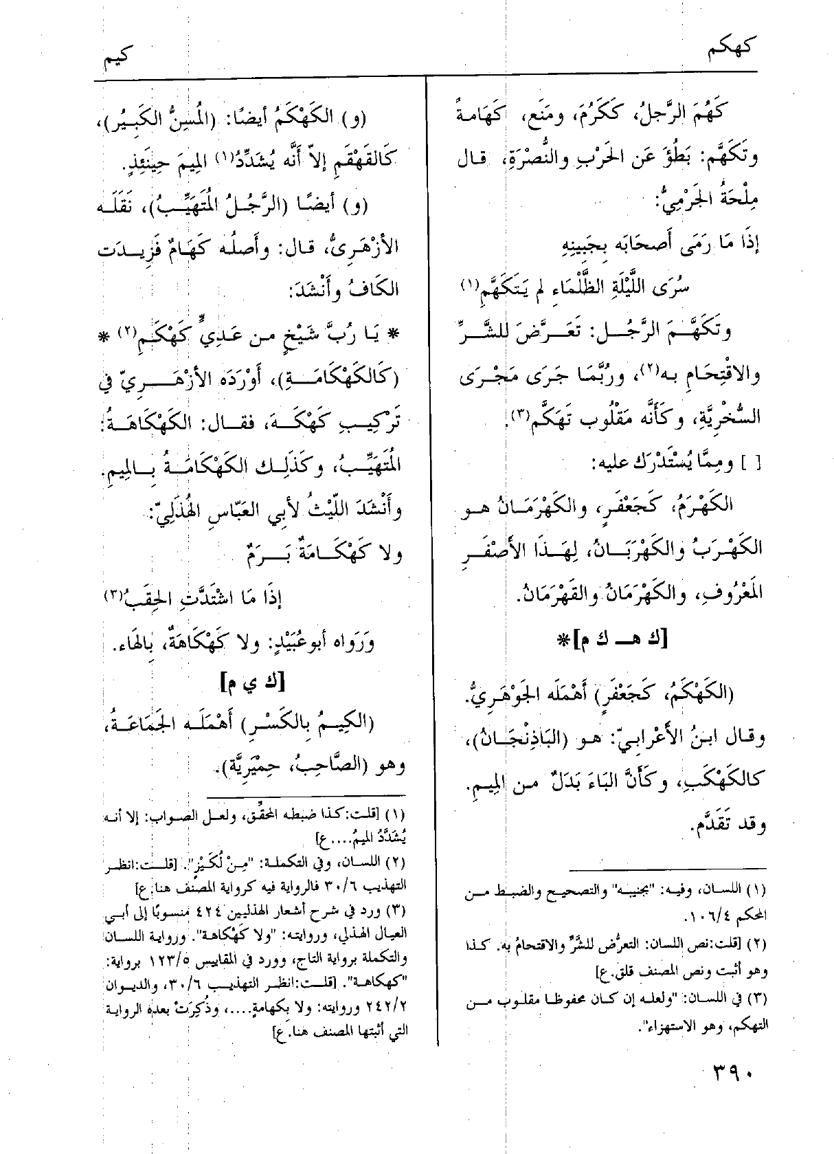 كَهُمَ الرَّجلُ، كَكَرُمَ، ومَنَع، كَهَامةً وتَكَهَّم: بَطُؤَ عَن الحَرْبِ والنُّصْرةِ، قَالَ مِلْحَةُ الجَرْمِيُّ: