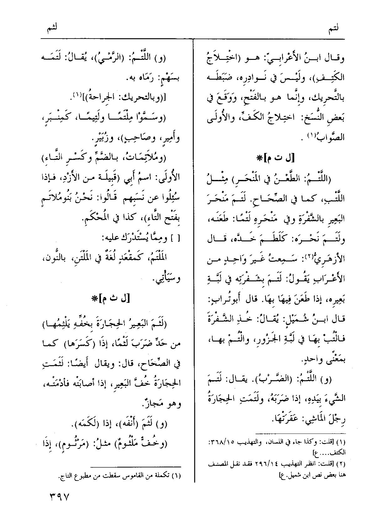 (اللَّتْمُ: الطَّعْنُ فِي المَنْحَرِ) مِثْلُ اللَّتْبِ، كَمَا فِي الصِّحَاحِ. لَتَمَ مَنْحَرَ البَعِيرِ بالشَّفْرَةِ وَفِي مَنْحَرِهِ لَتْمًا: طَعَنَه، ولَتَمَ نَحْرَه: كَلَطَمَ خَدَّه، قَالَ الأزهَرِيُّ: سَمِعتُ غَيرَ وَاحِدٍ من الأَعْرَابِ يَقُولُ: لَتَمَ بِشَفْرَته فِي لَبَّةِ بَعِيرِه، إِذا طَعَنَ فِيهَا بِهَا. قَالَ أَبو تُرابٍ: قَالَ ابنُ شُمَيْلٍ: يُقالُ: خُذِ الشَّفْرَةَ فالتْبْ بِهَا فِي لَبَّةِ الجَزُورِ، والْتُمْ بهَا، بمَعْنًى واحدٍ.