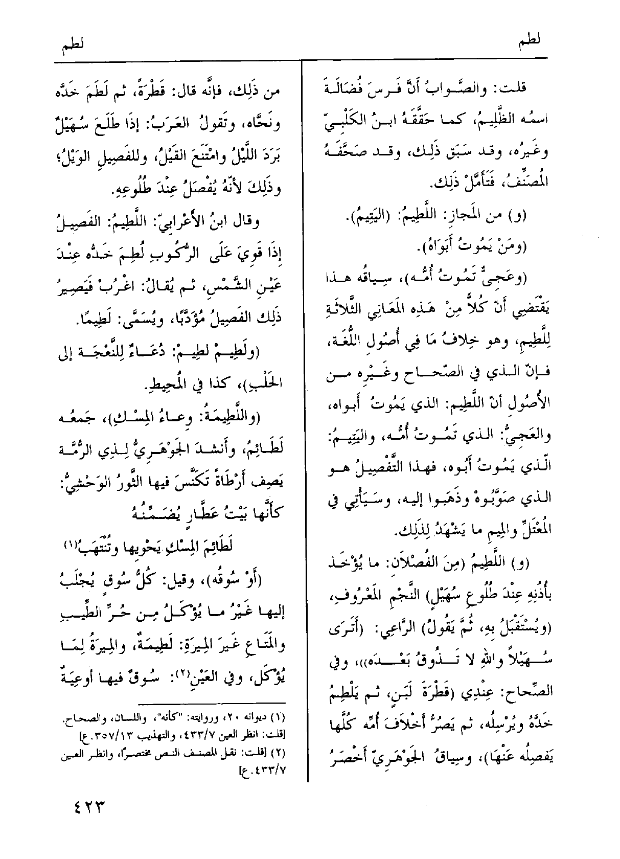 (و) اللَّطِيمُ (مِنَ الفُصْلاَنِ: مَا يُؤْخَذ بأُذُنِهِ عِنْدَ طُلُوعِ سُهَيْلٍ) النَّجْمِ المَعْرُوفِ، (ويُسْتَقْبَلُ بِهِ، ثُمَّ يَقُولُ) الرَّاعِي: (أَتَرَى سُهَيْلاً واللهِ لَا تَذُوقُ بَعْدَه)) ، وَفِي الصِّحاح: عِنْدِي (قَطْرَةَ لَبَنٍ، ثمَّ يَلْطِمُ خَدَّهُ ويُرْسِلُه، ثمَّ يَصُرُّ أَخْلاَفَ أُمِّه كُلَّها يَفصِلُه عَنْهَا) ، وسِياقُ الجَوْهَرِيّ أَخْصَرُ