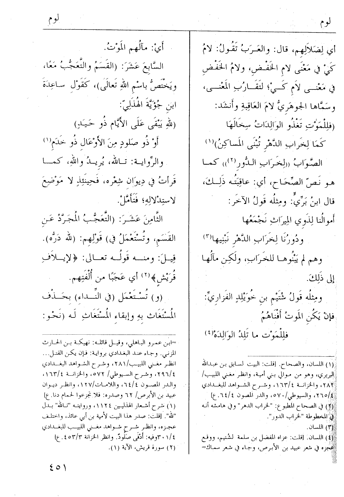 الثَّامِنَ عَشَرَ: (التَّعَجُّبُ المُجَرَّدُ عَنِ القَسَمِ، وتُسْتَعْمَلُ فِي) قَوْلِهِم: (لله دَرُّه) . قِيلَ: وَمِنْه قَولُه تَعَالَى: {لِإِيلَافِ قُرَيْش} أَي عَجَبًا من أُلْفَتِهم.