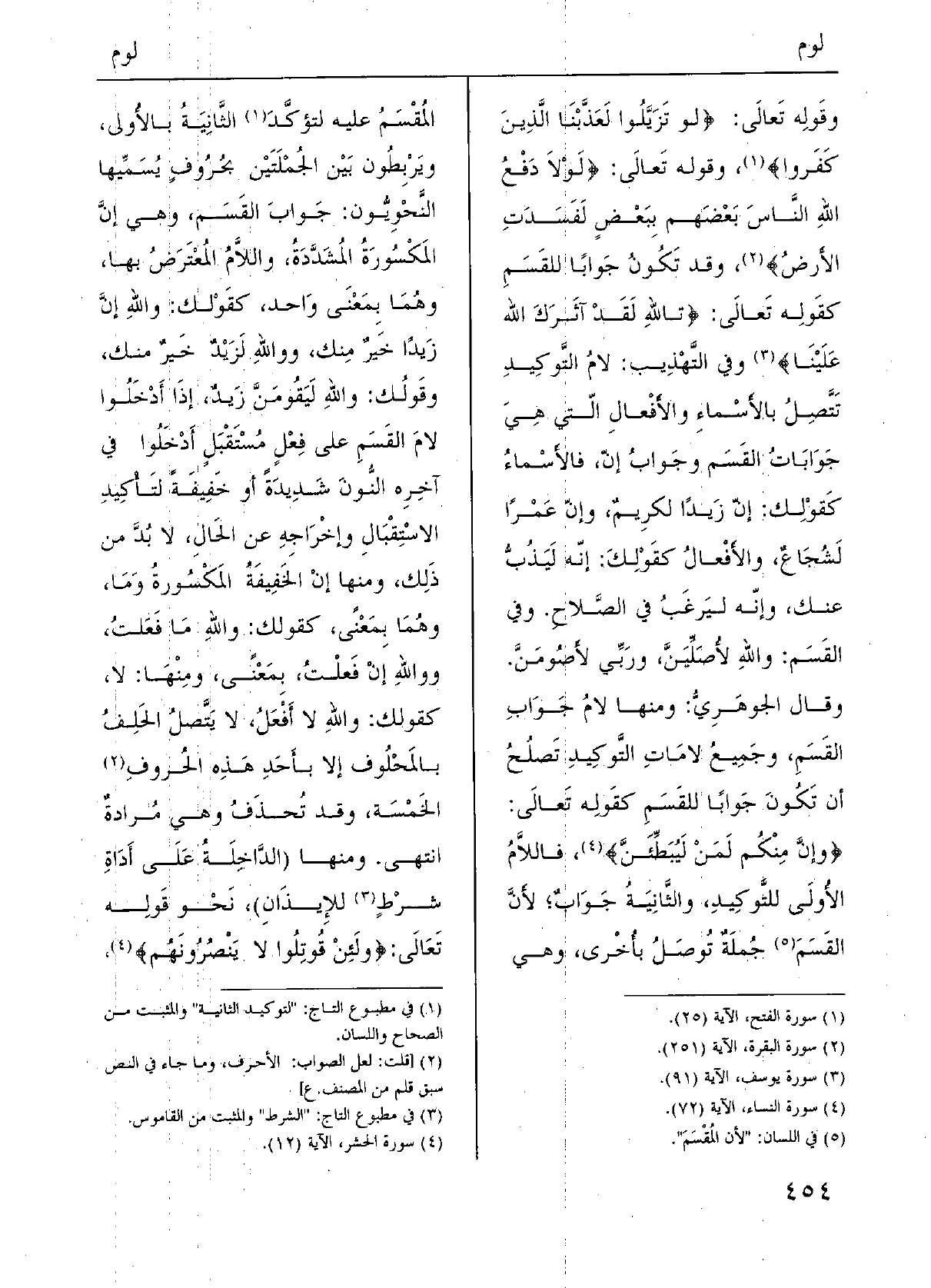 وقَولِه تَعالَى: {لَو تزيلوا لعذبنا الَّذين كفرُوا} ، وَقَوله تَعالَى: {لَوْلَا دفع الله النَّاس بَعضهم بِبَعْض لفسدت الأَرْض} ، وَقد تَكُونُ جَوابًا للقَسَم كقَولِه تَعالَى: {تالله لقد آثرك الله علينا} وَفِي التَّهْذِيب: لامُ التَّوكِيدِ تَتَّصِلُ بالأَسْماءِ والأَفْعالِ الّتي هِيَ جَوَابَاتُ القَسَم وجَوابُ إنّ، فالأَسْماءُ كَقوْلِك: إنّ زَيدًا لكريمٌ، وإنّ عَمْرًا لَشُجَاعٌ، والأَفْعالُ كقَوْلِكَ: إِنّه لَيَذُبُّ عَنْك، وإنّه ليَرغَبُ فِي الصَّلاحِ. وَفِي القَسَم: واللهِ لأُصَلِّيَنَّ، ورَبِّي لأَصُومَنَّ. وَقَالَ الجوهَرِيُّ: وَمِنْهَا لامُ جَوَابِ القَسَمِ، وجَمِيعُ لامَاتِ التَّوكِيدِ تَصلُحُ أَن تَكُونَ جَوابًا للقَسَمِ كقَولِه تَعالَى: {وَإِن مِنْكُم لمن ليبطئن} ، فاللاَّمُ الأُولَى للتَّوكِيدِ، والثَّانِيَةُ جَوَابٌ؛ لأَنَّ القَسَمَ جُملَةٌ تُوصَلُ بأُخْرى، وَهِي المُقْسَمُ عَلَيْهِ لتؤكِّدَ الثَّانِيَةُ بالأُولى، ويَرْبِطُون بَيْن الجُمْلَتَيْن بحُرُوفٍ يُسَمِّيها النَّحْوِيُّون: جَوابَ القَسَم، وَهِي إنَّ المَكْسُورَةُ المُشَدَّدَةُ، واللاَّمُ المُعْتَرَضُ بهَا، وهُمَا بِمَعْنَى وَاحد، كقَوْلك: واللهِ إنَّ زَيدًا خَيرٌ مِنك، وواللهِ لَزَيْدٌ خَيرٌ مِنْك، وقَولُك: واللهِ لَيَقُومَنَّ زَيدٌ، إذَا أَدْخَلُوا لامَ القَسَمِ على فِعْلٍ مُسْتَقْبَلٍ أَدْخَلُوا فِي آخِرِه النُّونَ شَدِيدَةً أَو خَفِيفَةً لتَأْكِيدِ الاسْتِقْبَالِ وإخْرَاجِهِ عَن الحَالِ، لَا بُدَّ من ذَلِك، وَمِنْهَا إنْ الخَفِيفَةُ المَكْسُورةُ وَمَا، وهُمَا بِمَعْنًى، كَقَوْلِك: واللهِ مَا فَعَلتُ، وواللهِ إنْ فَعلْتُ، بِمَعْنًى، ومِنْهَا: لَا، كَقَوْلِك: واللهِ لَا أَفْعَلُ، لَا يَتَّصلُ الحَلِفُ بالمَحْلُوف إلابأَحَدِ هّذِه الحُروفِ الخَمْسَة، وَقد تُحذَفُ وَهِي مُرادةٌ انْتهى. وَمِنْهَا (الدَّاخِلَةُ عَلَى أَدَاةِ شرْطٍ للإيذَانِ) ، نَحْو قَولِه تَعَالَى: {وَلَئِن قوتلوا لَا ينصرونهم} .