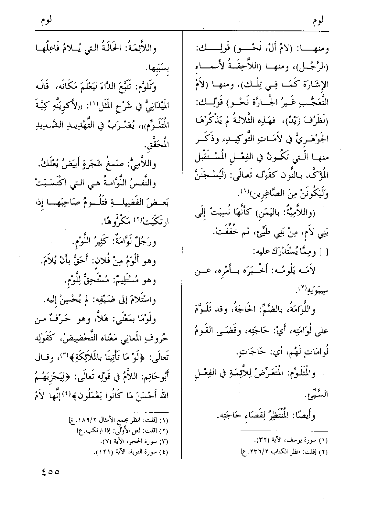 {واللُّوَامَةُ، بالضَّمِّ: الحَاجَةُ، وَقد} تَلَوَّمَ على {لُوَامَتِه، أَيْ: حَاجَتِه، وقَضَى القَومُ} لُوَامَاتٍ لَهُم، أَي: حَاجَاتٍ.