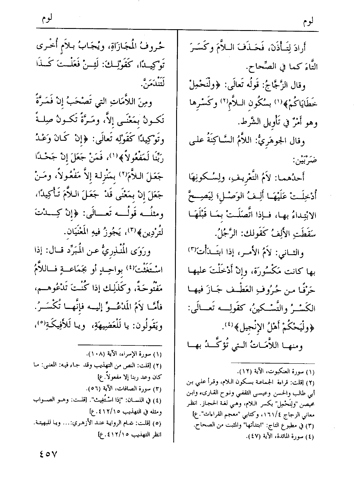 وَالثَّانِي: لاَمُ الأَمر، إِذا ابتَدَأْتَ بهَا كَانَت مَكْسُورَة، وإِنْ أَدْخَلْتَ عَلَيْهَا حَرْفًا من حُرُوفِ العَطْف جَازَ فِيهَا الكَسْرُ والتَّسْكينُ، كقَولِه تَعالَى: {وليحكم أهل الْإِنْجِيل} .