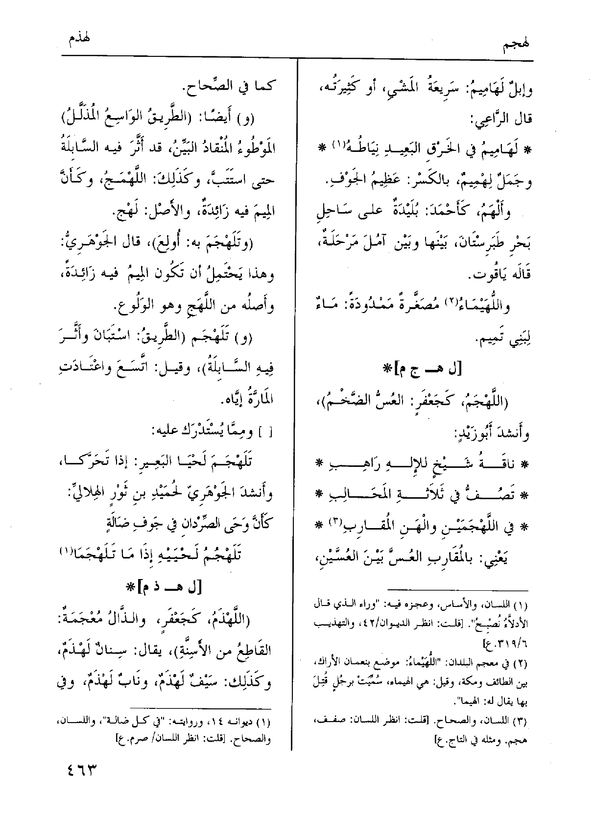 (و) تَلَهْجَم (الطَّرِيقُ: اسْتَبَانَ وأَثَّرَ فِيهِ السَّابِلَةُ) ، وَقيل: اتَّسَعَ واعْتَادَتِ المَارَّةُ إيَّاه. [] ومِمَّا يُسْتَدْرَك عَلَيْهِ: