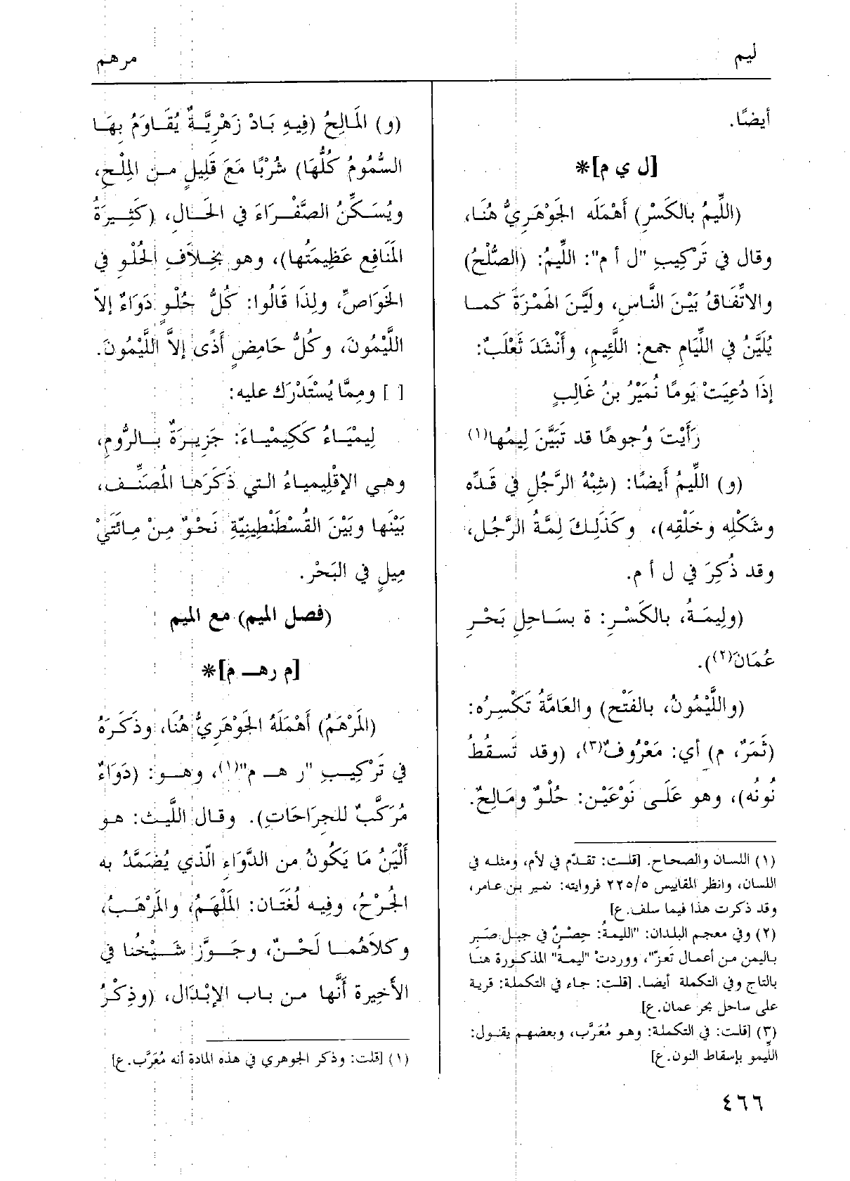 (} واللَّيْمُونُ، بالفَتْح) والعَامَّةُ تَكْسِرُه: (ثَمَرٌ، م) أَي: مَعْرُوفٌ، (وَقد تَسقُطُ نُونُه) ، وَهُوَ عَلَى نَوْعَيْن: حُلْوٌ ومَالِحٌ. (و) المَالِحُ (فِيهِ بَادْ زَهْرِيَّةٌ يُقَاوَمُ بِهَا السُّمُومُ كُلُّهَا) شُرْبًا مَعَ قَليلٍ من المِلْحِ، ويُسَكِّنُ الصَّفْرَاءَ فِي الحَالِ، (كَثِيرَةُ المَنَافِع عَظِيمَتُها) ، وَهُوَ بِخلاَفِ الحُلْوِ فِي الخَوَاصِّ، ولِذَا قَالُوا: كُلُّ حُلْوٍ دَوَاءٌ إلاّ {اللَّيْمُونَ، وكُلُّ حَامِضٍ أَذًى إلاَّ اللَّيْمُونَ. [] ومِمَّا يُسْتَدْرَك عَلَيْهِ: