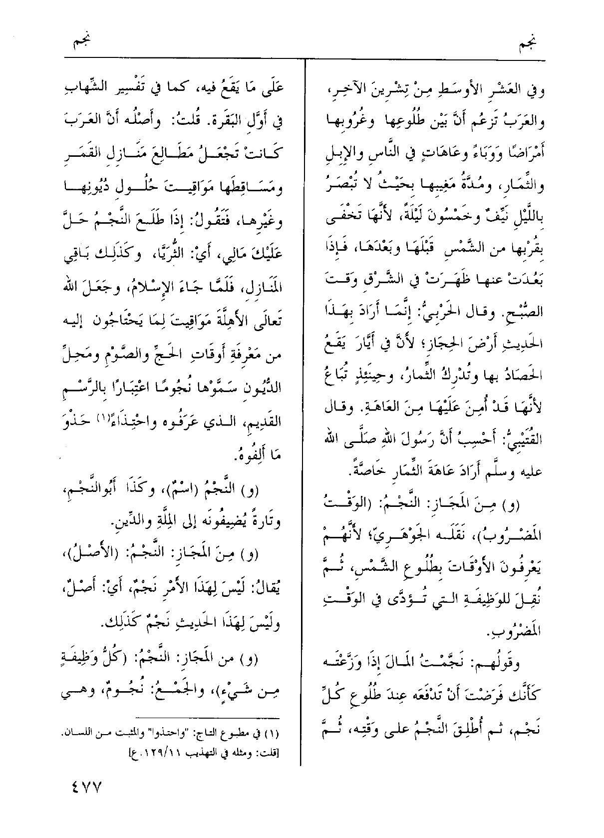 عَلَى مَا يَقَعُ فِيهِ، كَمَا فِي تَفْسِير الشِّهابِ فِي أَوَّلِ البَقَرة. قُلتُ: وأَصْلُه أَنَّ العَرَبَ كَانتْ تَجْعَلُ مَطَالِعَ مَنَازِلِ القَمَرِ ومَسَاقِطَها مَوَاقِيتَ حُلُولِ دُيُونِها وغَيْرِها، فَتَقُولُ: إِذَا طَلَعَ النَّجْمُ حَلَّ عَلَيْكَ مَالِي، أَي: الثُّرَيَّا، وكَذَلِك بَاقِي المَنَازِلِ، فَلَمَّا جَاءَ الإِسْلاَمُ، وجَعَلَ الله تَعالَى الأَهِلَّةَ مَوَاقِيتَ لِمَا يَحْتَاجُون إِلَيْهِ من مَعْرِفَةِ أَوقَاتِ الحَجِّ والصَّوْمِ ومَحِلِّ الدُّيُونِ سَمَّوْها نُجُومًا اعْتِبَارًا بِالرَّسْمِ القَدِيمِ، الَّذِي عَرَفُوه واحْتِذِاءً حَذْوَ مَ مَا أَلِفُوهُ.