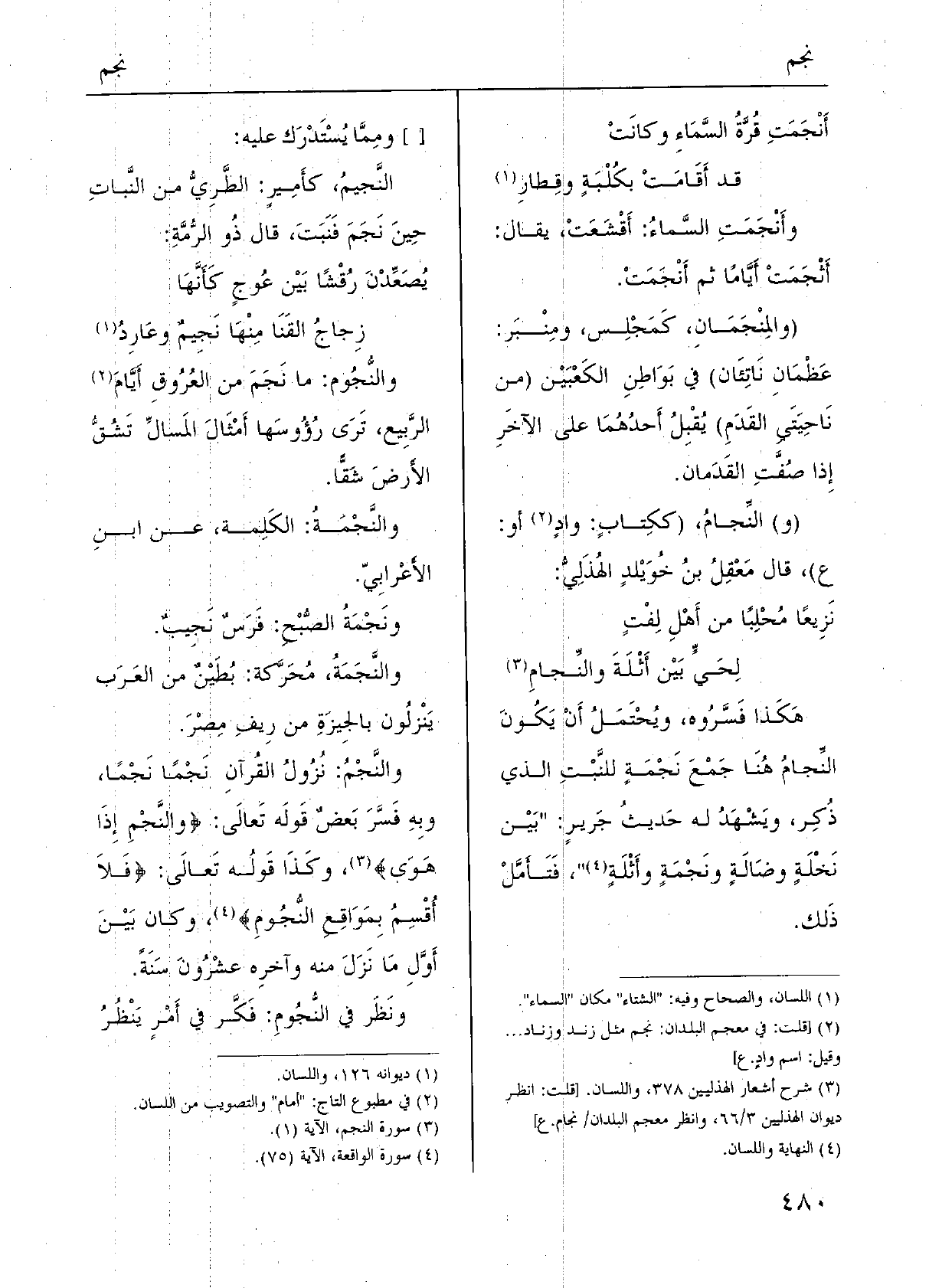 هَكَذا فَسَّرُوه، ويُحْتَمَلُ اَنْ يَكُونَ النِّجامُ هُنَا جَمْعَ نَجْمَةٍ للنَّبْتِ الَّذِي ذُكِر، ويَشْهَدُ لَهُ حَديثُ جَرِيرٍ: " بَيْن نَخْلَةٍ وضَالَةٍ ونَجْمَةٍ وأَثْلَةٍ "، فَتَأَمَّلْ ذَلك. [] ومِمَّا يُسْتَدْرَك عَلَيْهِ: