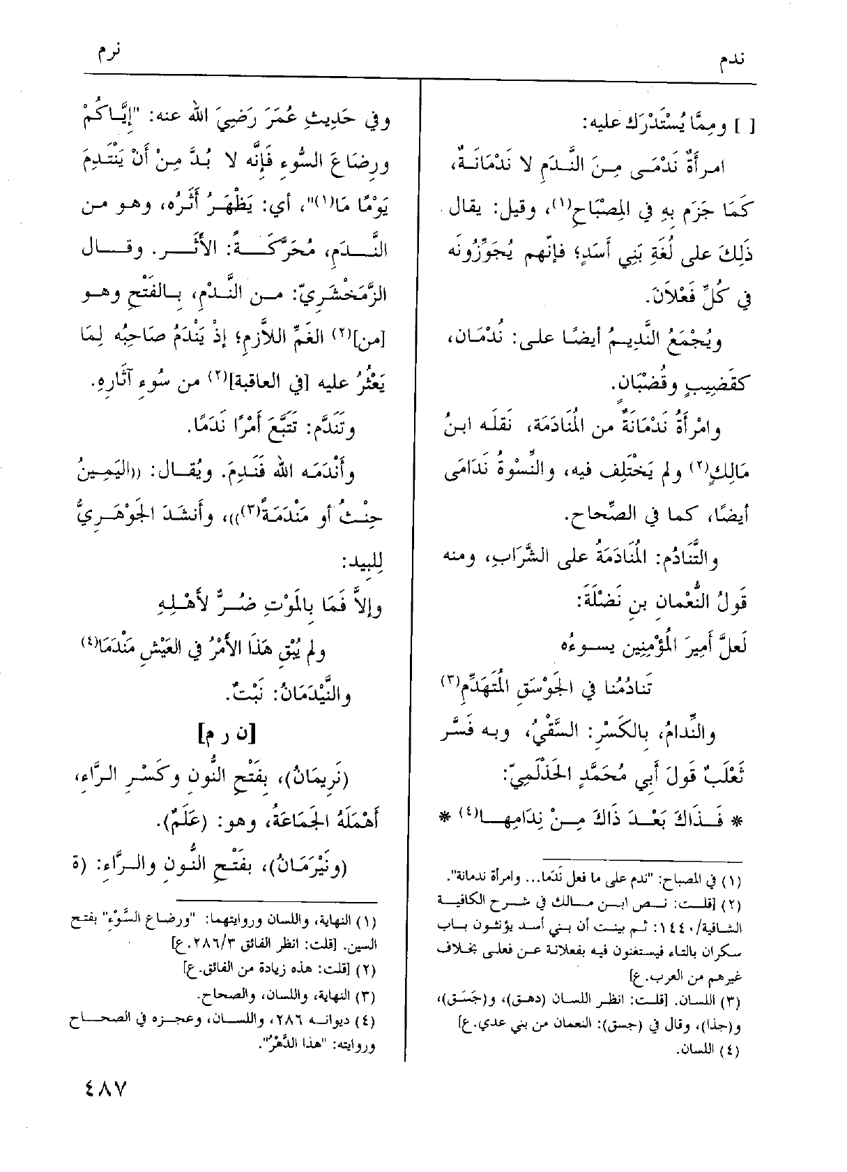 وَفِي حَدِيثِ عُمَرَ رَضِيَ الله عَنهُ: " إيَّاكُمْ ورِضَاعَ السُّوءِ فَإِنَّه لَا بُدَّ مِنء أَنْ يَنْتَدِمَ يَوْمًا مَا "، أَي: يَظْهَرُ أَثَرُه، وَهُوَ من النَّدَمِ، مُحَرَّكَةً: الأَثَر. وَقَالَ الزَّمَخْشَرِيّ: من النَّدْمِ، بِالفَتْحِ وَهُوَ [من] الغَمِّ اللاَّزمِ؛ إذْ يَنْدَمُ صَاحِبُه لِمَا يَعْثُرُ عَلَيْهِ [فِي الْعَاقِبَة] من سُوءِ آثَارِهِ.