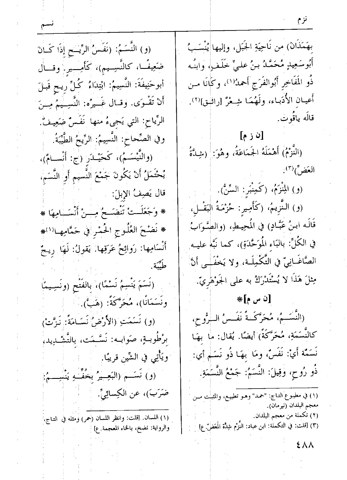 (و) نَسَمَتِ (الأَرْضُ نَسَامَةً: نَزَّتْ) بِرُطُوبةٍ، صَوابه: نَسَّمَت، بِالتَّشْدِيد، ويَأْتِي فِي الشِّين قَرِيبا.