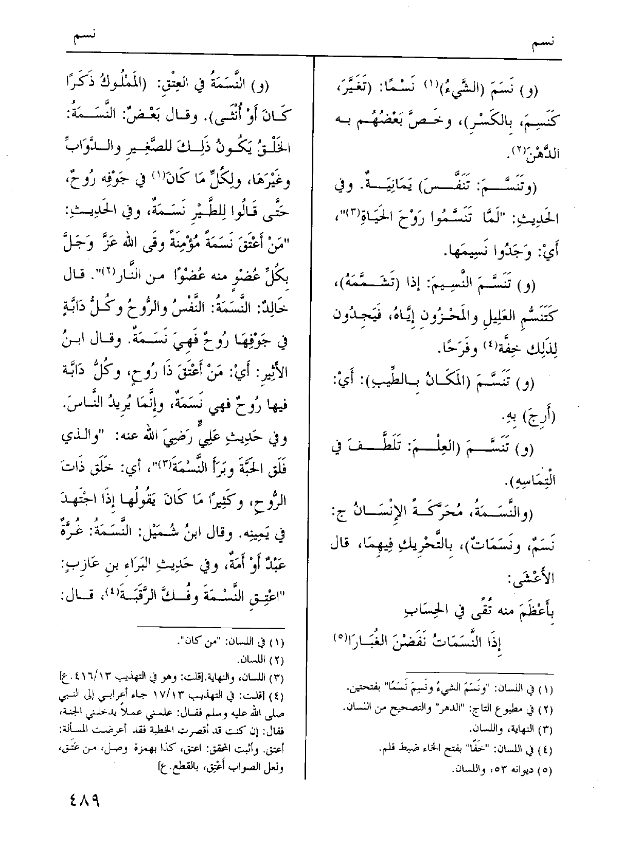 (و) النَّسَمَةُ فِي العِتْقِ: (المَمْلُوكُ ذَكَرًا كَانَ أَوْ أُنْثَى) . وَقَالَ بَعْضٌ: النَّسَمَةُ: الخَلْقُ يَكُونُ ذَلِكَ للصَّغِيرِ والدَّوَابِّ وغَيْرَهَا، ولِكُلِّ مَا كَانَ فِي جَوْفِه رُوحٌ، حَتَّى قَالُوا لِلطَّيْرِ نَسَمَةٌ، وَفِي الحَدِيثِ: " مَنْ أَعْتَقَ نَسَمَةً مُؤْمِنَةً وقَى الله عَزَّ وَجَلَّ بِكُلِّ عُضْوٍ مِنْهُ عُضْوًا من النَّار ". قَالَ خَالِدٌ: النَّسَمَةُ: النَّفْسُ والرُّوحُ وكُلُّ دَابَّةٍ فِي جَوْفِهَا رُوحٌ فَهِيَ نَسَمَةٌ. وَقَالَ ابنُ الأَثِيرِ: أَيْ: مَنْ اَعْتَقَ ذَا رُوحٍ، وكُلُّ دَابَّة فِيهَا رُوحٌ فَهِيَ نَسَمَةٌ، وإِنَّمَا يُرِيدُ النَّاسَ. وَفِي حَدِيثٍ عَلِيٍّ رَضِيَ الله عَنهُ: " وَالَّذِي فَلَقَ الحَبَّةَ وبَرَأَ النَّسْمَةَ "، أَي: خَلَق ذَاتَ الرُّوحِ، وكَثِيرًا مَا كَانَ يَقُولُها إِذَا اجْتَهَدَ فِي يَمِينِه. وَقَالَ ابنُ شُمَيْل: النَّسَمَةُ: غُرَّةٌ عَبْدٌ أَوْ أَمَةٌ، وَفِي حَدِيثِ البَرَاءِ بنِ عَازِبٍ: " اعْتِقِ النَّسْمَةَ وفُكَّ الرَّقَبَةَ، قَالَ: