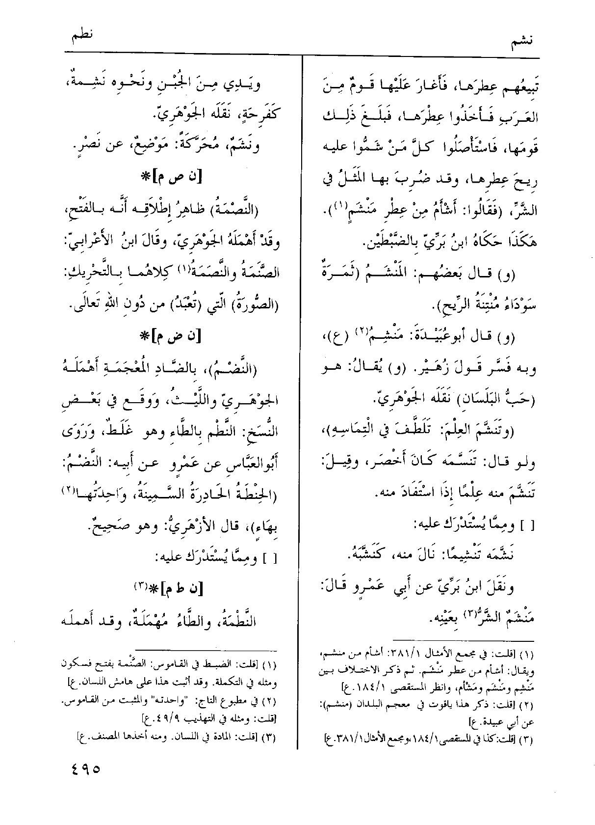 (وتَنَشَّمَ العِلْمَ: تَلَطَّفَ فِي الْتِمَاسِهِ) ، وَلَو قَالَ: تَنَسَّمَه كَانَ أَخْصَر، وقِيلَ: تَنَشَّمَ مِنْهُ عِلْمًا إِذَا اسْتَفَادَ مِنْهُ. [] ومِمَّا يُسْتَدْرَك عَلَيْهِ: