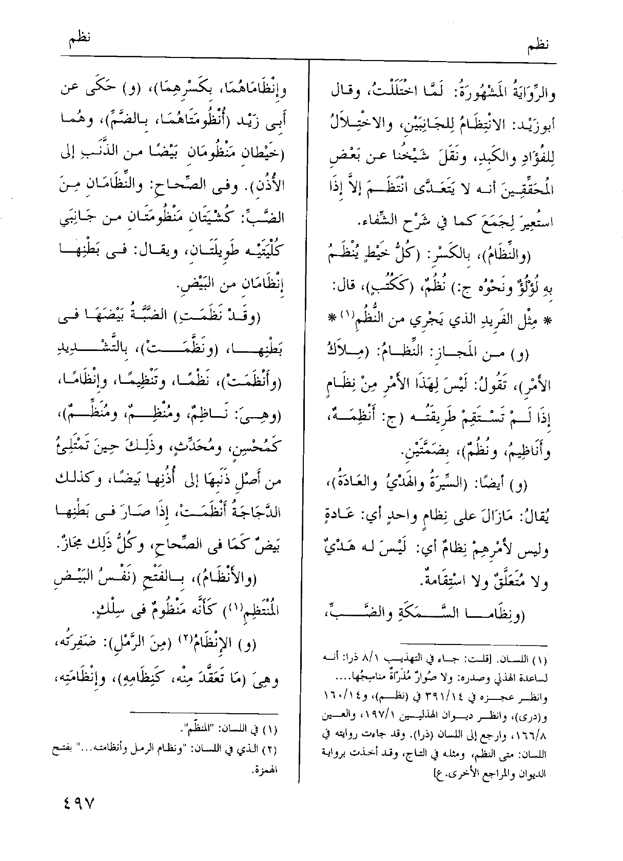 وإِنْظَامَاهُمَا، بِكَسْرِهِمَا) ، (و) حَكَى عَن أَبِي زَيْد (أُنْظُومَتَاهُمَا، بِالضَّمِّ) ، وهُما (خَيْطانِ مَنْظُومَانِ بَيْضًا من الذَّنَبِ إِلَى الأُذُنِ) . وَفِي الصِّحاح: والنِّظَامَانِ مِنَ الضَّبِّ: كُشْيَتَانِ مَنْظُومَتَانِ من جَانِبَي كُلْيَتَيْه طَوِيلَتَانِ، وَيُقَال: فِي بَطْنِها إِنْظَامَانِ من البَيْضِ.