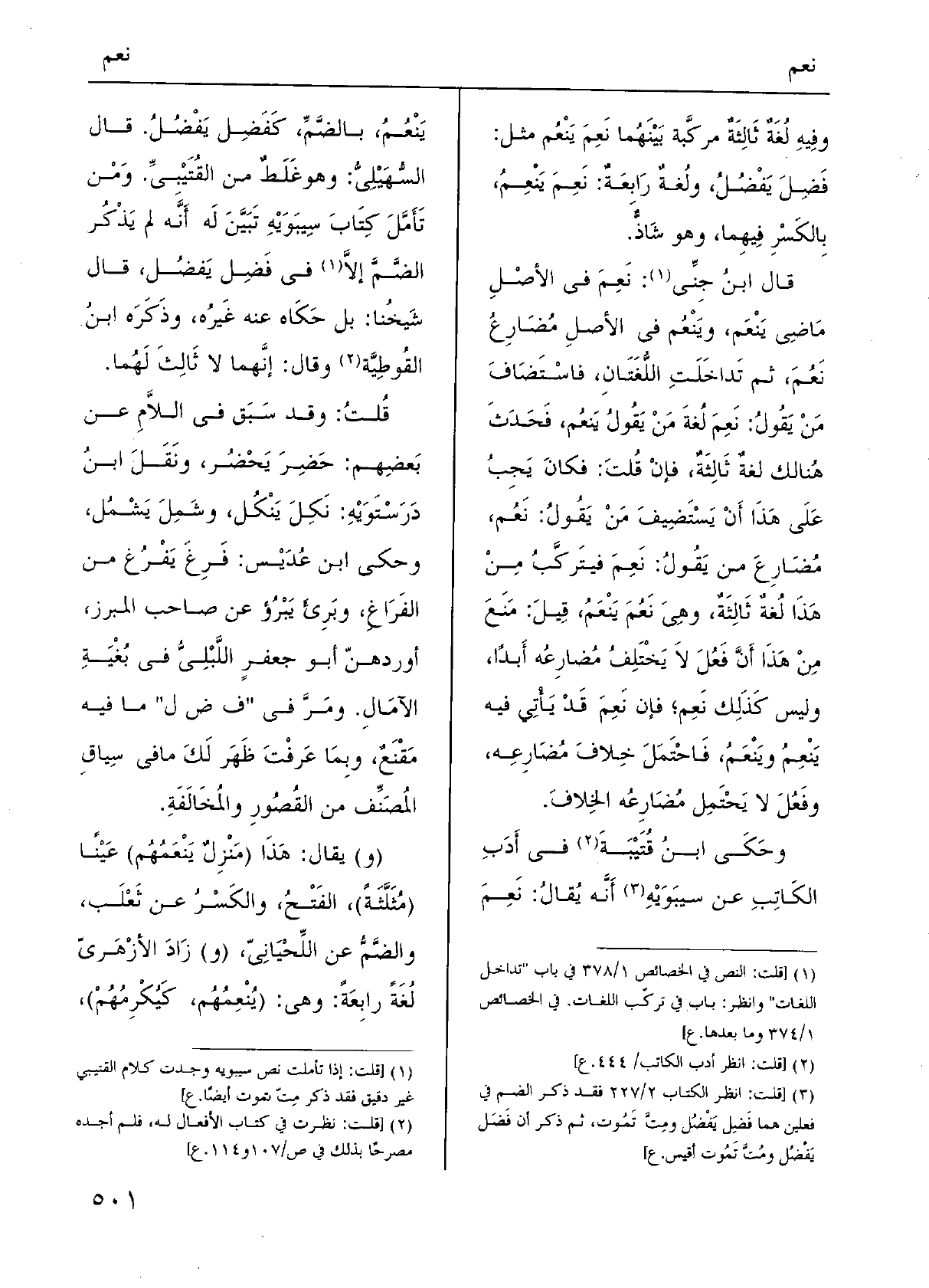 وحَكَى ابنُ قُتَيْبَةَ فِي أَدَبِ الكَاتِبِ عَن سيبَوَيْهِ أَنَّه يُقالُ: نَعِمَ يَنْعُمُ، بالضَّمِّ، كَفَضِل يَفْضُلُ. قَالَ السُّهَيْلِيُّ: وَهُوَ غَلَطٌ من القُتَيْبِيِّ. وَمنْ تَأَمَّلَ كِتَابَ سِيبَوَيْهِ تَبَيَّنَ لَه أَنَّه لم يَذْكُر الضَّمَّ إلاَّ فِي فَضِل يَفضُل، قَالَ شَيخُنا: بل حَكَاه عَنهُ غَيرُه، وذَكَرَه ابنُ القُوطِيَّة وَقَالَ: إنَّهما لَا ثَالِثَ لَهُما.