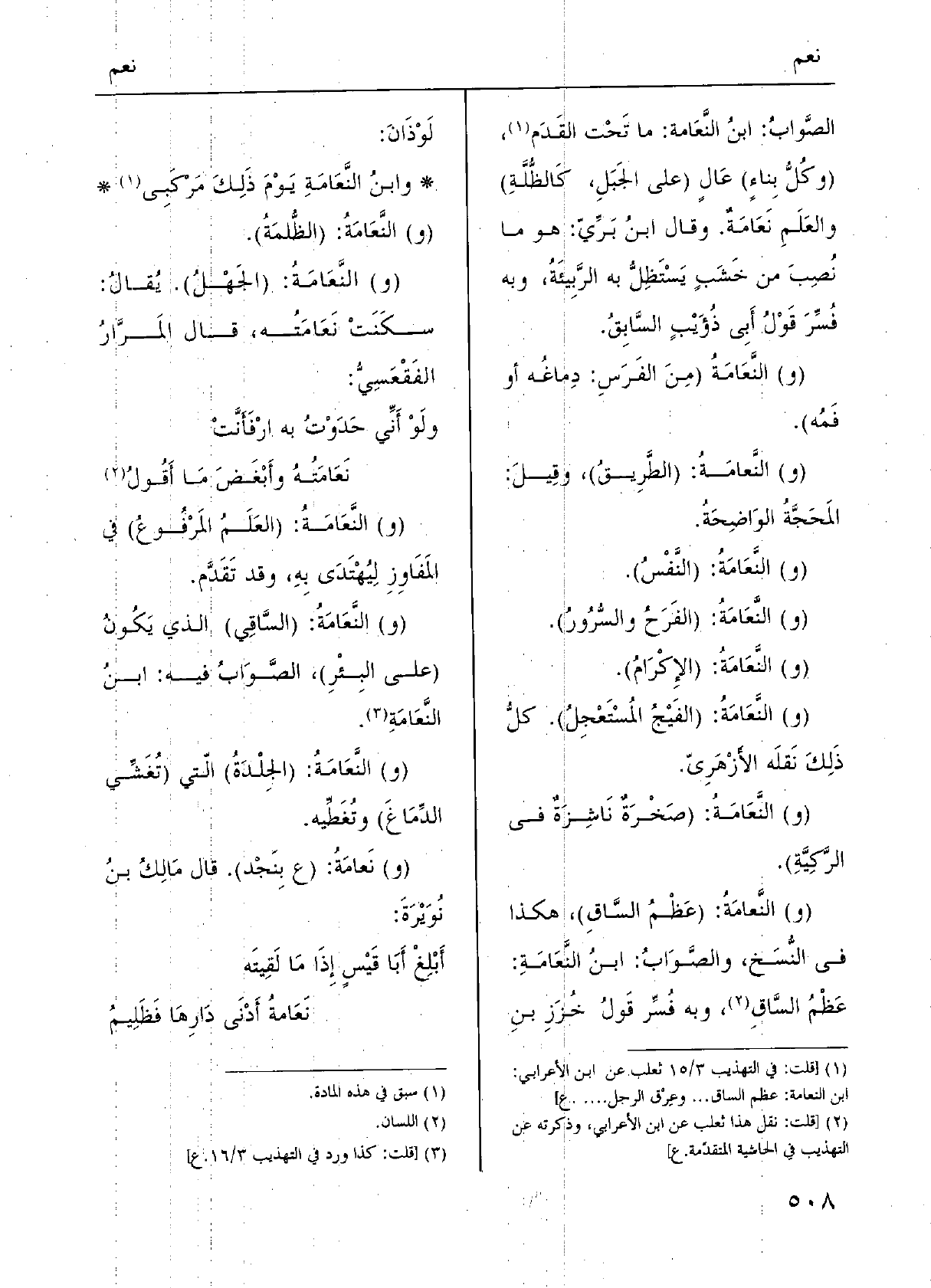 (و) النَّعامَةُ: (عَظْمُ السَّاقِ) ، هَكَذَا فِي النُّسَخ، والصَّوَابُ: ابنُ النَّعَامَةِ: عَظْمُ السَّاقِ، وَبِه فُسِّر قَولُ خَزَزِ بنِ لَوْذَانَ: