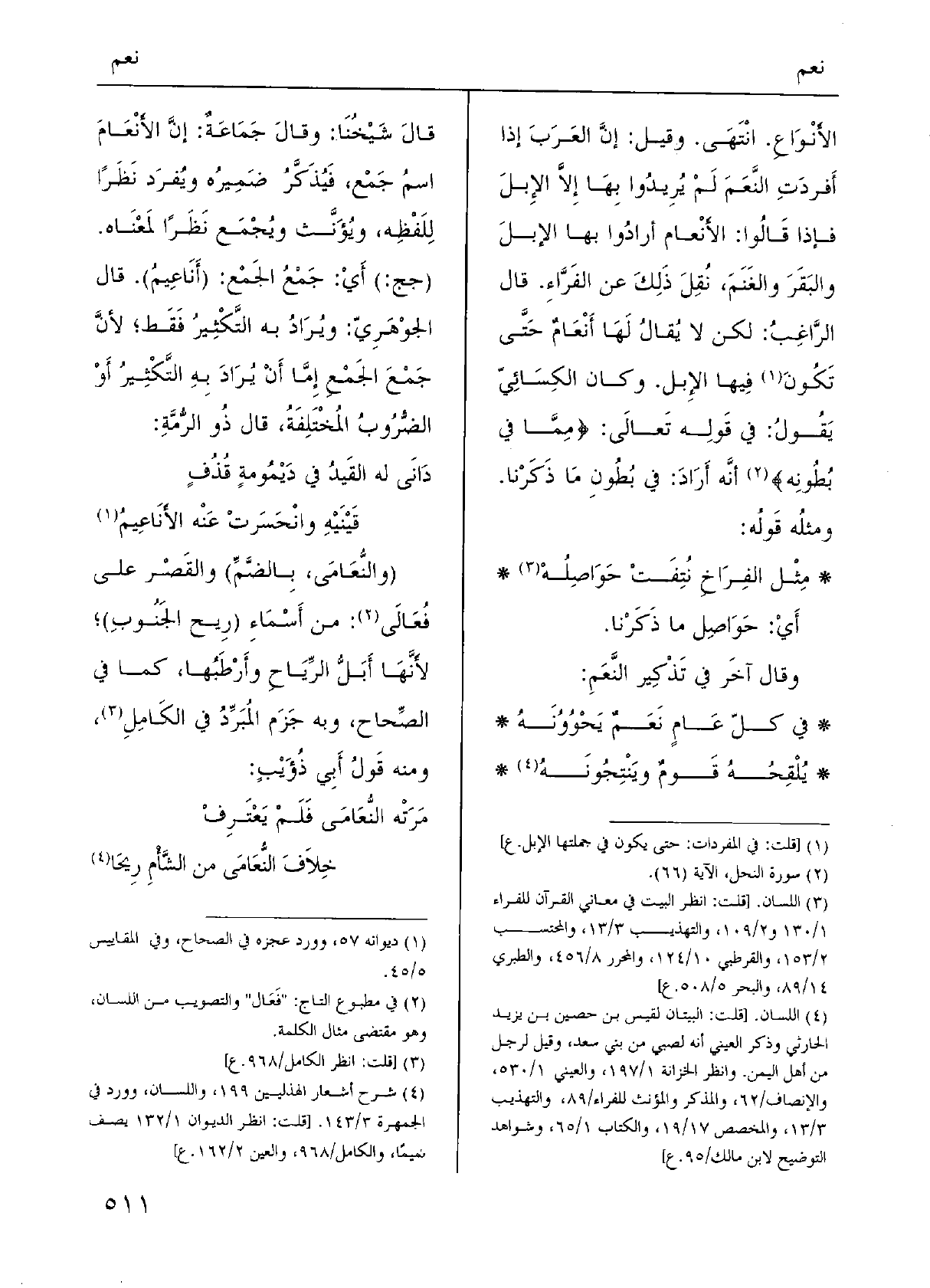 الأَنْوَاعِ. وانْتَهَى. وَقيل: إِنَّ العَرَبَ إِذا أَفردَتِ النَّعَمَ لَمْ يُرِيدُوا بِهَا إِلاَّ الإِبلَ فَإِذا قَالُوا: الأَنْعام أرادُوا بهَا الإبلَ والبَقَرَ والغَنَمَ، نُقِلَ ذَلِكَ عَن الفَرَّاءِ. قَالَ الرَّاغِبُ: لَكِن لَا يُقالُ لَهَا أَنْعَامٌ حَتَّى تَكُونَ فِيها الإِبل. وَكَانَ الكِسَائِيّ يَقُولُ: فِي قَولِه تَعالَى: {مِمَّا فِي بطونه} أنَّه أَرَادَ: فِي بُطُونِ مَا ذَكَرْنا.
