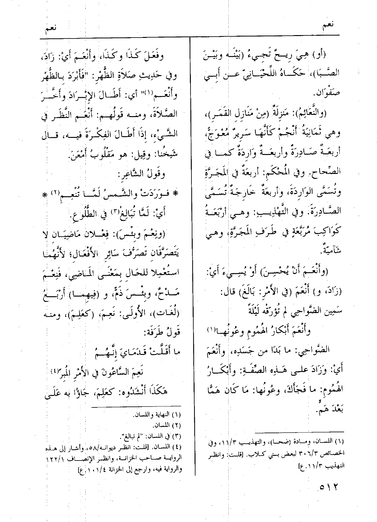 وفَعَلَ كَذَا وكَذَا، وأَنْعَمَ أَيْ: زَادَ، وَفِي حَدِيثِ صَلاَةِ الظُّهْرِ: " فَأَبْرَدَ بِالظُّهْر وأَنْعَم " أَي: أَطَالَ الإِبْرَادَ وأَخَّرَ الصَّلاَةَ، وَمِنْه قَولُهم: أَنْعَم النَّظَر فِي الشَّيْءِ، إِذَا أَطَالَ الفِكْرَةَ فِيهِ، قَالَ شَيخُنا: وقِيل: هُوَ مَقْلُوبُ أَمْعَنَ.