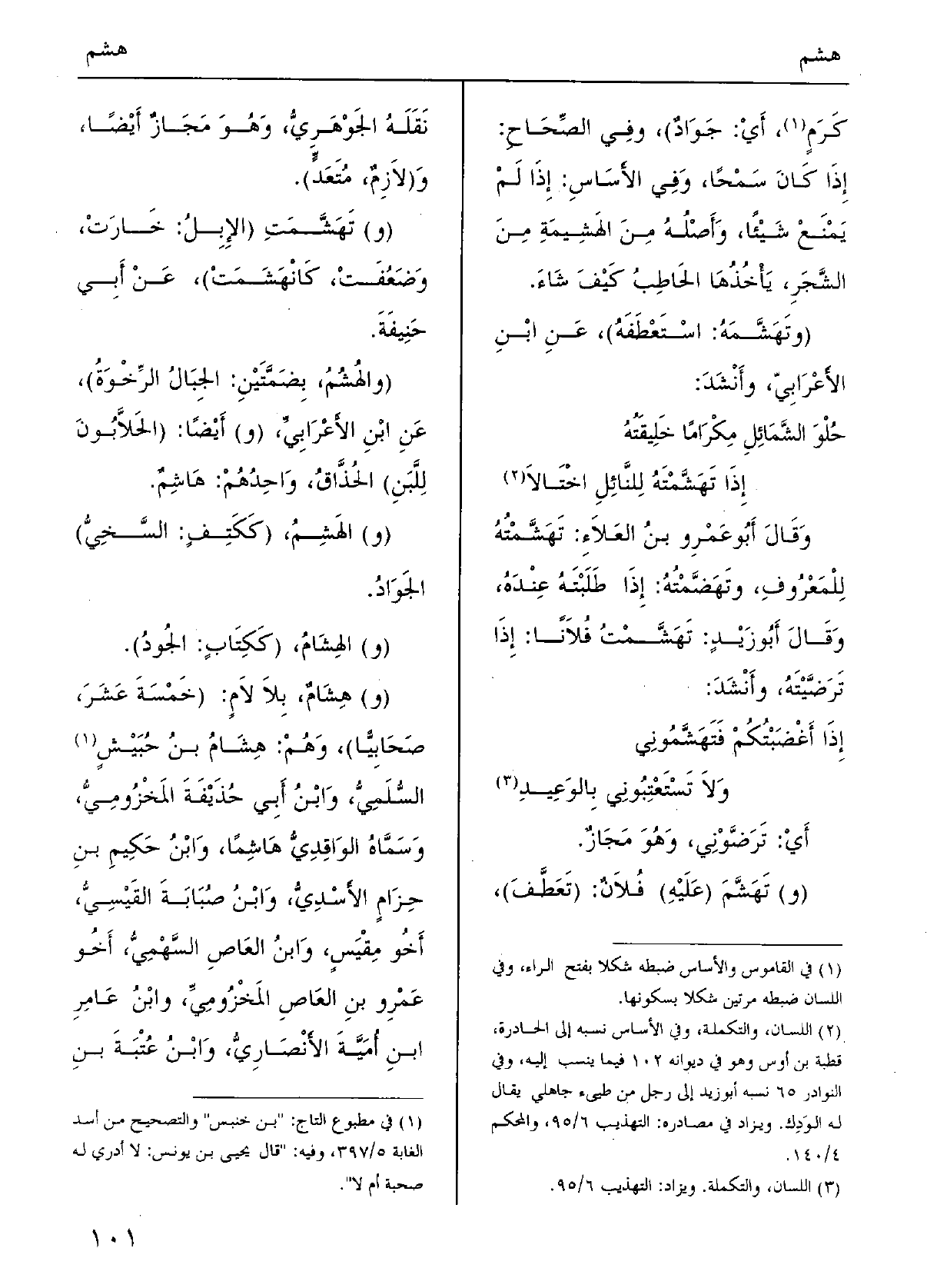 أَي: ترضَّوْنِي، وَهُوَ مَجَازٌ. (و) تَهَشَّمَ (عَلَيْهِ) فُلانٌ: (تَعَطَّفَ) ، نَقَلَهُ الجَوْهَرِيُّ، وَهُوَ مَجَازٌ أَيْضًا، وَ (لاَزِمٌ، مُتَعَدٍّ) . (و) تَهَشَّمَتِ (الإِبِلُ: خَارَتْ، وضَعُفَتْ، كانْهَشَمَتْ) ، عَنْ أَبِي حَنِيفَةَ. (والهُشُمُ، بِضَمَّتَيْنِ: الجِبَالُ الرِّخْوَةُ) ، عنِ ابنِ الأعْرَابِيِّ، (و) أَيْضا: (الحَلاَّبُونَ للَّبَنِ) الحُذَّاقُ، وَاحِدُهُمْ: هَاشِمٌ. (و) الهَشِيمُ، (كَكَتِفٍ: السَّخِيُّ) الجَوَادُ. (و) الهِشَامُ، (كَكِتَابٍ: الجُودُ) . (و) هِشَامٌ، بِلاَ لاَمٍ: (خَمْسَةَ عَشَرَ، صَحَابِيًّا) ، وَهُمْ: هِشَامُ بنُ حُبَيْشٍ السُّلَمِيُّ، وَابنُ أَبِي حُذَيْفَةَ المَخْزُومِيُّ، وَسَمَّاهُ الوَاقِدِيُّ هَاشِمًا، وابنُ حَكِيمِ بنِ حِزَامٍ الأَسْدِيُّ، وابنُ صُبَابَةَ القَيْسِيُّ، أَخُو مِقْيَسٍ، وابنُ العَاصِ السَّهْمِيُّ، أَخُو عَمْرو بنِ العَاصِ المخَزْوميِّ، وابنُ عَامِرِ ابنِ أُمَيَّةَ الأنْصَارِيُّ، وابنُ عُتْبَةَ بنِ