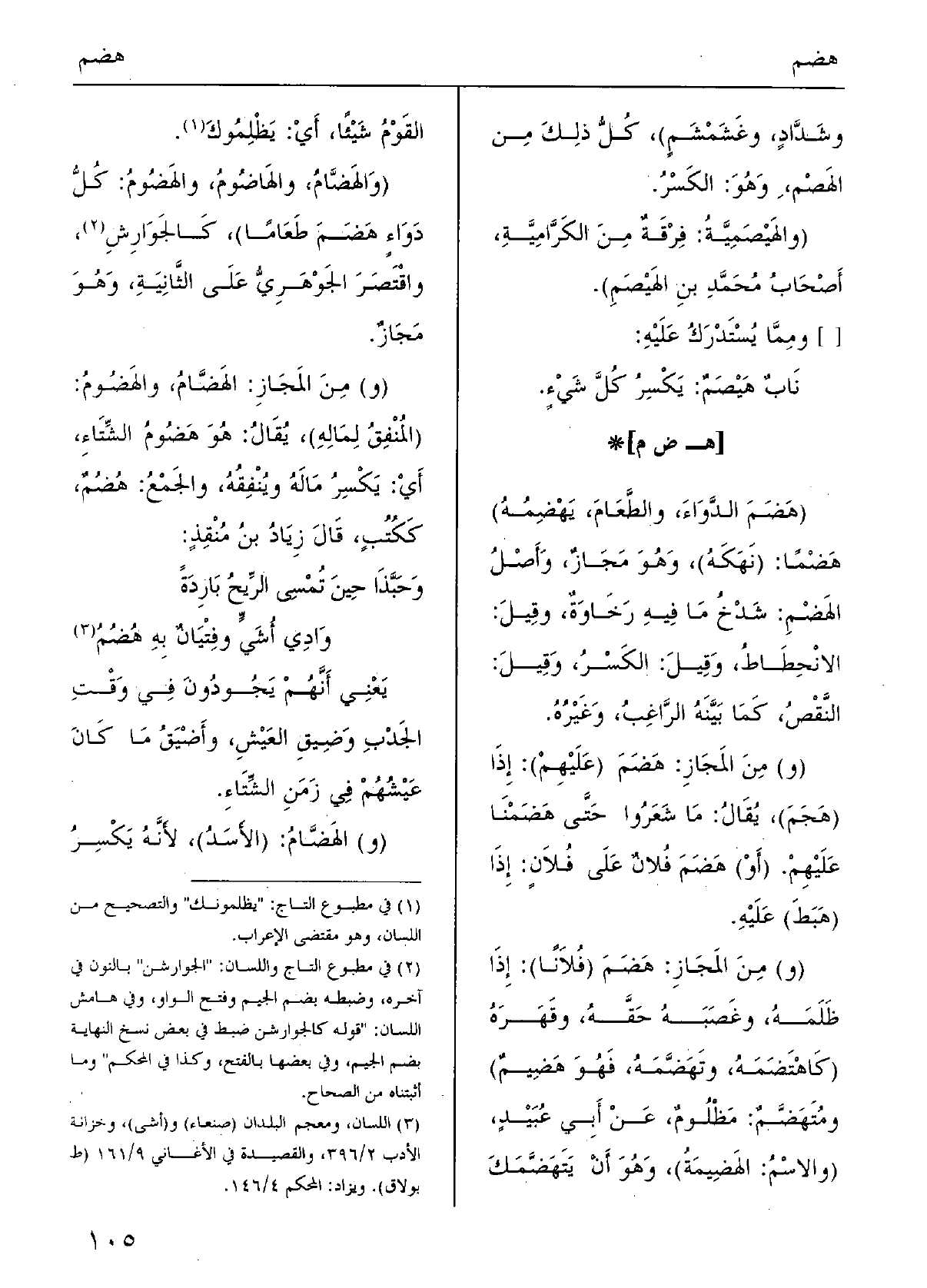 (هَضَمَ الدَّوَاءَ، والطَّعَامَ، يَهْضِمُهُ) هَضْمًا: (نَهَكَهُ) ، وَهُوَ مَجَازٌ، وَأَصْلُ الهَضْمِ: شَدْخُ مَا فِيهِ رَخَاوَةٌ، وقِيلَ: الانْحِطَاطُ، وَقِيلَ: الكَسْرُ، وَقِيلَ: النَّقْصُ، كَمَا بَيَّنَهُ الرَّاغِبُ، وَغَيْرُهُ. (و) مِنَ المَجَازِ: هَضَمَ (عَلَيْهِمْ) : إذَا (هَجَمَ) ، يُقالُ: مَا شَعَرُوا حَتَّى هَضَمْنَا عَلَيْهِمْ. (أَوْ) هَضَمَ فُلانٌ عَلَى فُلاَنٍ: إذَا (هَبَطَ) عَلَيْهِ. (و) مِنَ المَجَازِ: هَضَمَ (فُلاناً) : إذَا ظَلَمَهُ، وغَضَبَهُ حَقَّهُ، وقَهَرَهُ (كَاهْتَضَمَهُ، وتَهَضَّمَهُ، فَهُوَ هَضِيمٌ) ومُتَهَضَّمٌ: مَظْلُومٌ، عَنْ أَبِي عُبَيْدٍ، (والاسْمُ: الهَضِيمَةُ) ، وَهُوَ أنْ يَتَهَضَّمَكَ القَوْمُ شَيْئاً، أَيْ: يَظْلِمُوكَ. (والهَضَّامُ، والهَاضُومُ، والهَضُومُ: كُلُّ دَوَاءٍ هَضَمَ طَعَاماً) ، كَالجَوارِشِ، واقْتَصَرَ الجَوْهَرِيُّ عَلَى الثَّانيَةِ، وهوَ مَجَازٌ. (و) مِنَ المَجازِ: الهَضَّامُ، والهَضُوم: (المُنْفِقُ لِمَالِهِ) ، يُقَالُ: هُوَ هَضُومُ الشِّتَاءِ، أيْ: يَكْسِرُ مَالَهُ ويُنْفِقُهُ، والجَمْعُ: هُضُمٌ، كَكُتُبٍ، قالَ زِيَادُ بنُ مُنْقِذٍ: