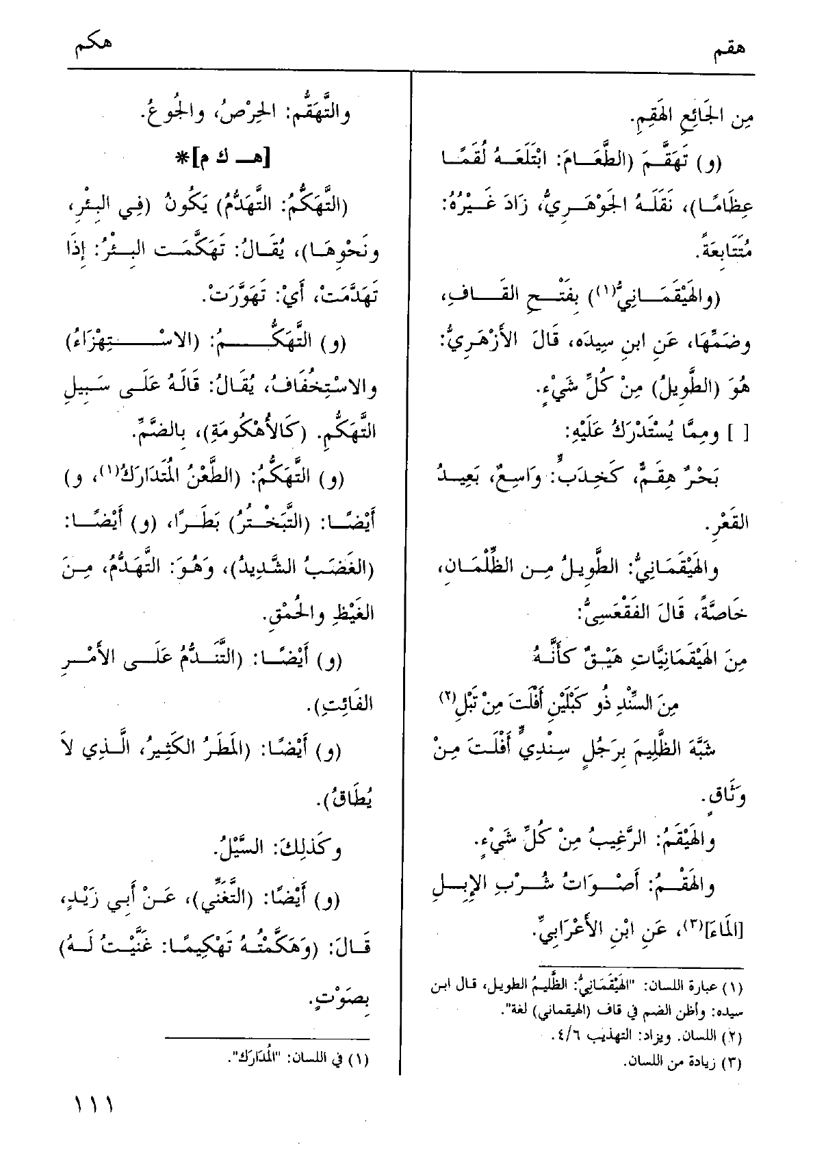 شَبَّهَ الظّلِيمَ بِرَجُلٍ سِنْدِيٍّ أَفْلَتَ مِنْ وَثَاقٍ. والهَيْقَمُ: الرَّغِيبُ مِنْ كُلِّ شَيْءٍ. والهَقْمُ: أَصْوَاتُ شُرْبِ الإبِلِ [المَاءَ] ، عنِ ابنِ الأَعْرَابِيِّ. والتَّهَقُّم: الحِرْصُ، والجُوعُ.