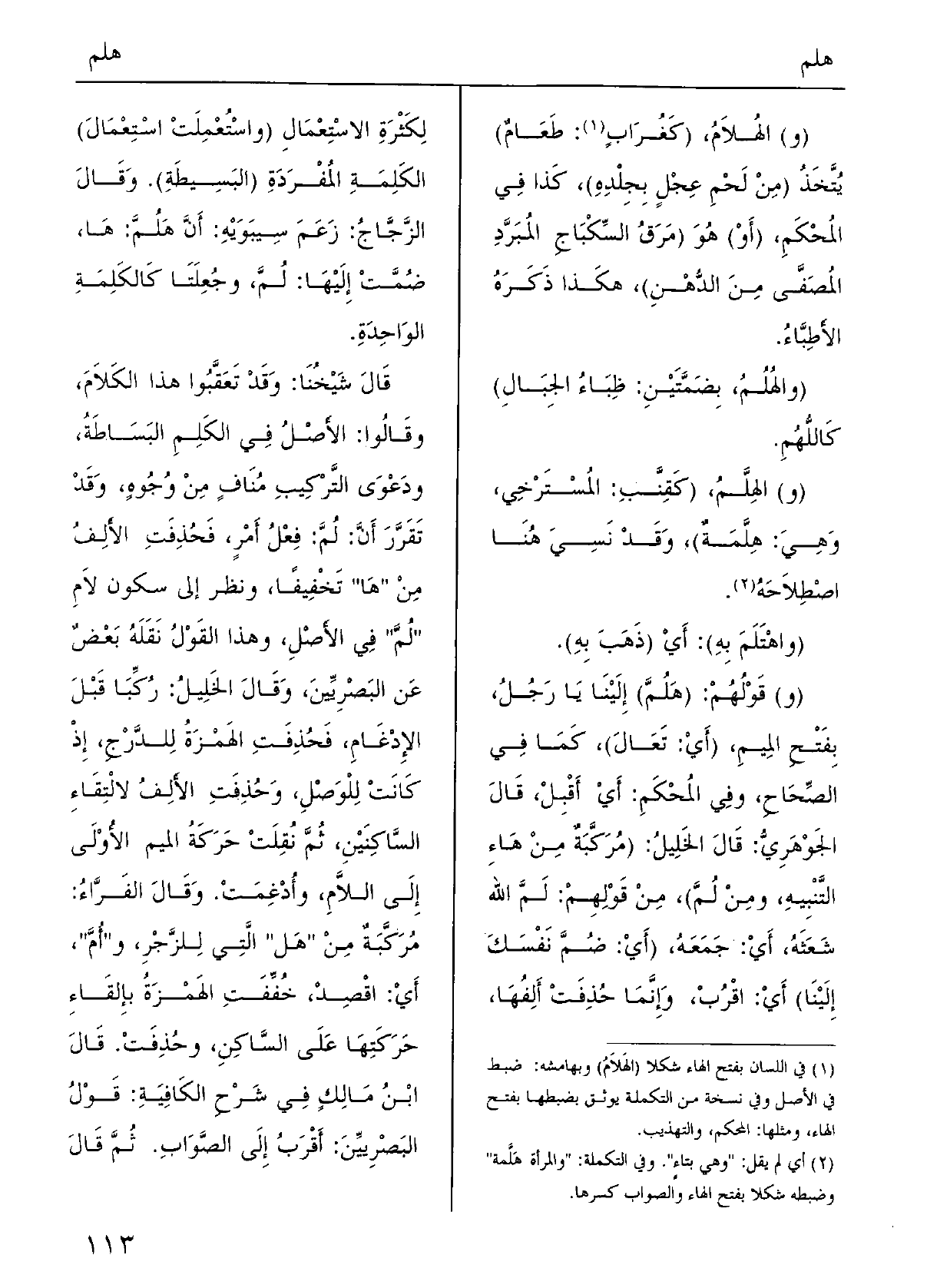 (و) الهُلاَمُ، (كَغُرَابٍ: طَعَامٌ) يُتَّخَذُ (مِنْ لَحْمِ عِجْلٍ بِجِلْدِهِ) ، كَذا فِي المُحْكَمِ، (أَوْ) هُوَ (مَرَقُ السِّكْبَاجِ المُبَرَّدِ المُصَفَّى مِنَ الدَّهْنِ) ، هكَذا ذَكَرَهُ الأطِبَّاءُ. (والهُلُمُ، بِضَمَّتَيْنِ: ظِبَاءُ الجِبَالِ) كَاللُّهُمِ. (و) الهِلَّمُ، (كَقِنَّبِ: المُسْتَرْخِي، وَهِيَ: هِلَّمَةٌ) ، وقَدْ نَسِيَ هُنَا اصْطِلاَحَهُ. (واهْتَلَمَ بِهِ) : أَيْ (ذَهَبَ بِهِ) . (و) قَوْلُهُمْ: (هَلُمَّ) إِلَيْنَا يَا رَجُلُ، بِفَتْحِ المِيمِ، (أيْ: تَعَالَ) ، كَمَا فِي الصِّحَاحِ، وفِي المُحْكَمِ: أَيْ أَقْبِلْ، قَالَ الجَوْهَرِيُّ: قَالَ الخَلِيلُ: (مُرَكَّبَةٌ مِنْ هَاءِ التَّنْبِيهِ، ومِنْ لُمَّ) ، مِنْ قَوْلِهِمْ: لَمَّ الله شَعَثَهُ، أيْ: جَمَعَهُ، (أيْ: ضُمَّ نَفْسَكَ إِلَيْنا) أيْ: اقْرُبْ، وَإنَّمَا حُذِفَتْ أَلِفُهَا، لِكَثْرَةِ الاستِعْمَالِ (واستُعْمِلَتْ اسْتِعْمَالَ) الكَلِمَةِ المُفْرَدَةِ (البَسِيطَةِ) . وقالَ الزَّجَّاجُ: زَعَمَ سِيبَوَيْهِ: أنَّ هَلُمَّ: هَا، ضُمَّتْ إِلَيْهَا: لُمَّ، وجُعِلَتَا كَالكَلِمَةِ الوَاحِدَةِ. قَالَ شيخُنا: وقدَْ تَعَقَّبُوا هَذَا الكَلاَمَ، وقالُوا: الأَصْلُ فِي الكَلِمِ البَسَاطَةُ، ودَعْوَى التَّرْكِيبِ مُنَافٍ مِنْ وُجُوهٍ، وقَدْ تَقَرَّرَ أنَّ: لُمَّ: فِعْلَ أمْرٍ، فَحُذِفَتِ الألِفُ مِنْ " هَا " تَخْفِيفًا، وَنظر إِلَى سُكُون لاَمِ " لُمَّ " فِي الأَصْلِ، وَهَذَا القَوْلُ نَقَلَهُ بَعْضٌ عَن البَصْرِيِّينَ، وقالَ الخَلِيلُ: رُكِّبَا قَبْلَ الإِدْغَامِ، فَحُذِفَتِ الهَمْزَةُ لِلدَّرْجِ، إذْ كَانتْ للْوَصْلِ، وحُذِفَتِ الألِفُ لالْتِقَاء السَّاكِنَيْنِ، ثُمَّ نُقِلَتْ حَرَكَةُ الْمِيم الأُوْلَى إِلَى اللاَّمِ، وأُدْغِمَتْ. وَقالَ الفَرَّاءُ: مُرَكَّبَةٌ مِنْ " هَل " التِي للزَّجْرِ، و " أُمَّ "، أَي: اقْصِدْ، خُفِّفَتِ الهَمْزَةُ بإِلقَاءِ حَرَكَتِهَا عَلَى السَّاكِنِ، وحُذِفَتْ. قالَ ابنُ مَالِكٍ فِي شَرْحِ الكَافِيَةِ: قَوْلُ البَصْرِييِّنَ: أَقْرَبُ إِلَى الصَّوَابِ. ثمَّ قالَ