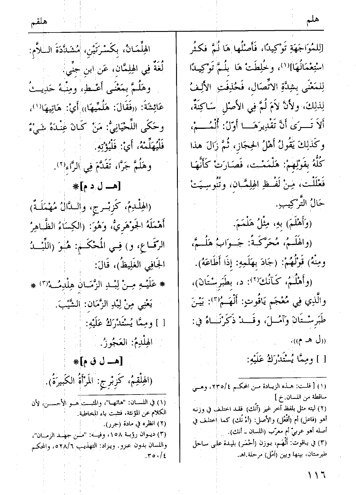 [لِلمُوَاجَهَةِ تَوْكِيداً، فَأَصْلُها هَا لُمَّ فكثُر اسْتِعَمَالُها] ، وخُلِطَتْ هَا بُلمَّ تُوْكِيداً لِلمَعْنَى بِشِدَّةِ الاتِّصَالِ، فَحْذِفَتِ الأَلِفُ لِذلِكَ، ولأَنَّ لاَمَ لَمَّ فِي الأصْلِ سَاكِنَةٌ، أَلاَ تَرَى أَنَّ تَقْدِيرَهَا أَوّلُ: أَلْمُمْ، وكَذلِكَ يَقُولُ أَهْلُ الحِجَازِ، ثُمَّ زَالَ هَذَا كُلُّهُ بِقَوْلِهِمْ: هَلْمَمْت، فَصَارَتْ كَأَنَّهَا فَعْلَلْت، مِنْ لَفْظِ الهِلِمَّانِ، وتُنُوسِيَتْ حَالُ التَّرْكِيبِ. (وَأَهْلَمَ) بِهِ، مِثْلُ هَلْمَمَ. (والهَلَمُ، مُحَرَّكَةً: جَوَابُ هَلُمَّ، ومِنْهُ) قَوْلُهُمْ: (جَادَ بِهَلَمِهِ: إِذَا أَطَاعَهُ) . (وأَهْلُمُ، كَآنُكُ: د، بِطَبَرِسْتَانَ) ، والَّذِي فِي مُعْجَمِ يَاقُوتٍ: أَلْهَمُ: بَيْنَ طَبَرسْتَانَ وَآمُلَ، وقَدْ ذَكَرْنَاهُ فِي: (ل هـ م)) . [] ومِمَّا يُستْتَدْرَكَ عَلَيْهِ: الهِلِّمَانُ، بِكَسْرَتَيْنِ، مُشَدَّدَةَ اللاَّمِ: لُغَةٌ فِي الهِلِمَّانِ، عَن ابنِ جِنِّي. وهَلُمَّ بِمَعْنَى أَعْطِ، ومِنْهُ حِدِيثُ عَائِشَةَ: ((فَقَالَ: هَلُمِّيها)) أَيْ: هَاتِيهَا، وحَكَى اللِّحْيَانِيُّ: مَنْ كَانَ عِنْدُه شَيْءٌ فَلْيُهَلِّمْهُ، أَيْ: فَلْيُؤْتِهِ. وهَلُمَّ جَرَّا، تَقَدَّمَ فِي الرَّاءِ.