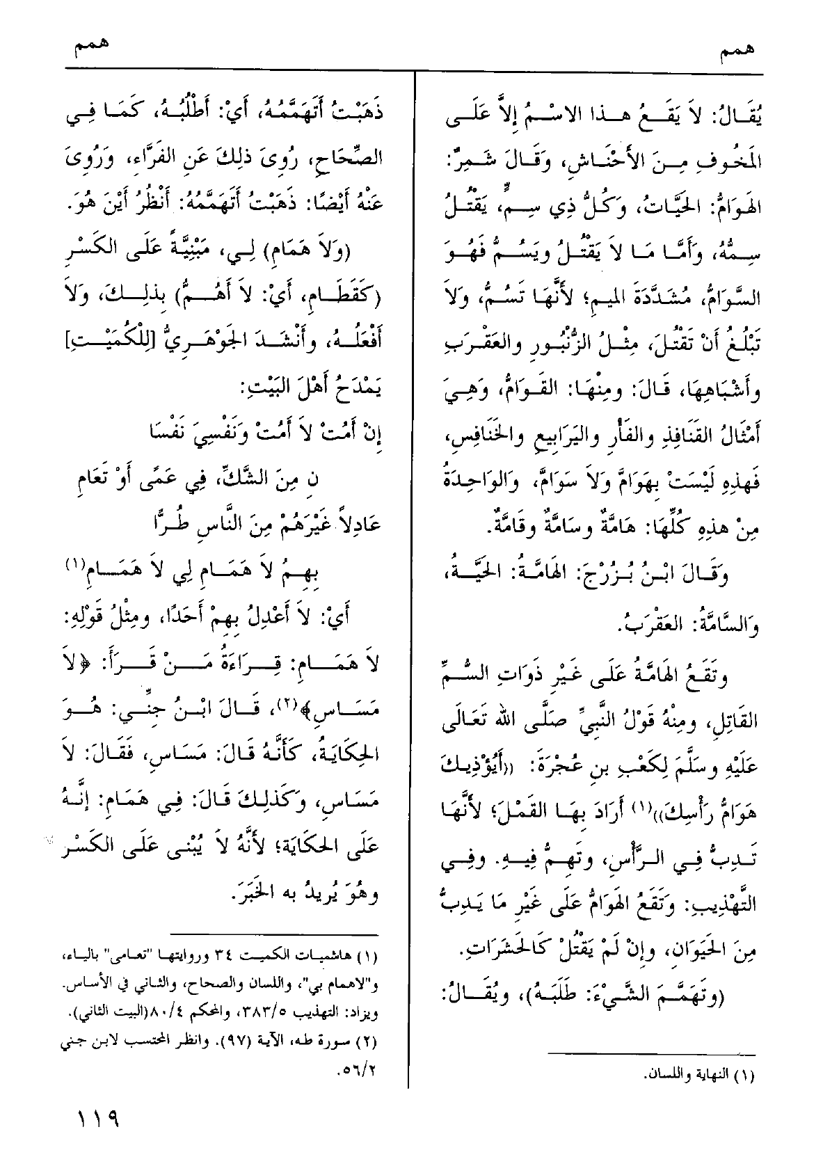 لِكَعْبِ بنِ عُجْرَةَ: " أَيُؤْذِيكَ هَوَامُّ رَأْسِكَ " أَرَادَ بِهَا القَمْلَ؛ لأنَّهَا تَدِبُّ فِي الرَّأْسِ، {وتَهِمُّ فِيهِ. وفِي التَّهْذِيبِ: وتَقَعَ الهَوَامُّ عَلَى غَيْرِ مَا يَدِبُّ مِنَ الحَيَوَانِ، وإنْ لَمْ يَقْتُلْ كَالحَشَرَاتِ. (} وتَهَمَّمَ الشَّيْءَ: طَلَبَهُ) ، ويُقاَلُ: ذَهَبْتُ {أَتَهَمَّمُهُ، أَيْ أَطْلُبُهُ، كَمَا فِي الصِّحَاح، رُوِيَ ذلِكَ عَنِ الفَرَّاءِ، ورُوِيَ عَنْهُ أيْضًا: ذَهَبْتُ أتَهَمَّمُهُ: أنْظُرُ أَيْنَ هُوَ. (ولاَ} هَمَامِ) لِي، مَبْنِيَّةً عَلَى الكَسْرِ (كَقعامِ، أَيْ: لاَ {أَهُمُّ) بِذلَكَ، وَلاَ أَفْعَلُهُ، وأَنْشَدَ الجَوْهَرِيُّ [لِلْكُمَيْتٍِ يَمْدَحُ أَهْلَ البَيْتِ:
