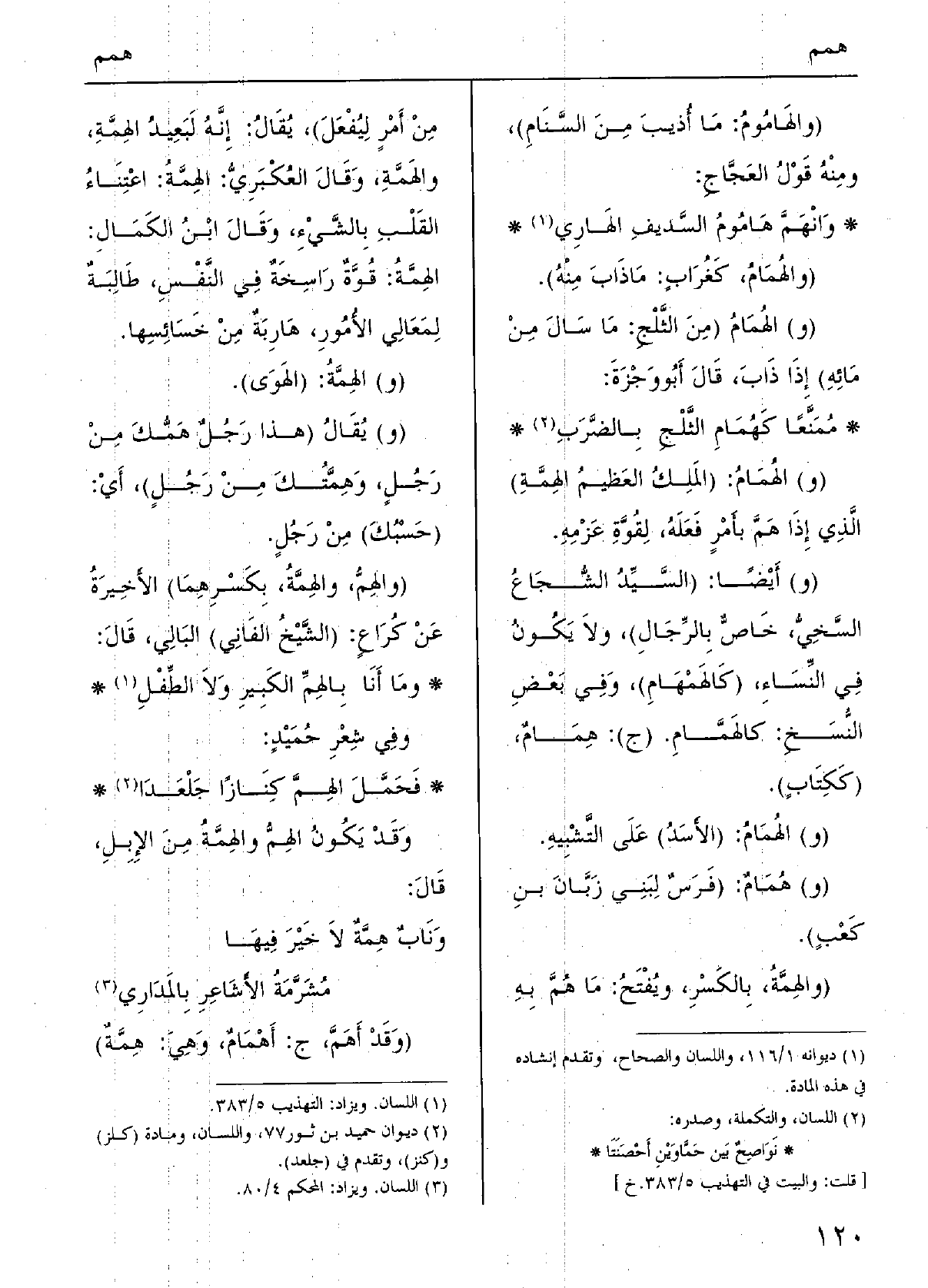 (و) الهُمَامُ: (المَلِكُ العَظيمُ الهِمَّةِ) الَّذيِ إِذَا} هَمَّ بأَمْرٍ فَعَلَهُ، لِقُوَّةِ عَزْمِهِ. (و) أَيْضاً: (السَّيِّدُ الشُّجَاعُ السِّخِيُّ، خَاصٌّ بِالرِّجَالِ) ، ولاَ يَكُونُ فِي النِّسَاءِ، ( {كَالهَمْهَامِ) ، وَفِي بَعْضِ النُّسَخِ:} كالهَمَّامِ. (ج) : {هِمَامٌ، (كَكِتَابٍ) . (و) الهُمَامُ: (الأَسَدُ) عَلَى التَّشْبِيهِ. (و) } هُمَامٌ: (فَرَسٌ لِبَنِي زَبَّانَ بنِ كَعْبٍ) . {والهِمَّةُ، بِالكَسْرِ، ويُفْتَحُ: مَا} هُمَّ بِهِ مِنْ أَمْرٍ لِيُفْعَل) ، يُقَالُ: إِنَّهُ لَبَعِيدُ {الهِمَّةِ،} والهَمَّةِ، وَقَالَ العُكْبَرِيُّ: {الهِمَّةُ: اعْتَنَاءُ القَلْبِ بِالشَّيْءِ، وَقَالَ ابْنُ الكَمَالِ: الهِمَّةُ: قُوَّةٌ رَاسِخَةٌ فِي النَّفْس، طَالِبَةٌ لَمَعَالِي الأُمُورِ، هَارِبَةٌ مِنْ خَسَائِسِها. (و) الهِمَّةُ: (الهَوَى) . (و) يُقَالُ (هَذَا رَجُلٌ} هَمُّكَ مِنْ رَجُلٍ، {وَهِمَّتُكَ مِنْ رَجُلٍ) ، أَيْ: (حَسْبُكَ) مِنْ رَجُلٍ. (} والهِمُّ، {والهِمَّةُ، بِكَسْرِهِمَا) الأخِيرَةُ عَنْ كُرَاعٍ: (الشِّيْخُ الفَانِي) البَالِي، قَالَ: ومَا أَنَا بِالِهمِّ الكَبِيرِ وَلاَ الطِّفْلِ وَفِي شِعْرِ حُمَيْدٍ:
