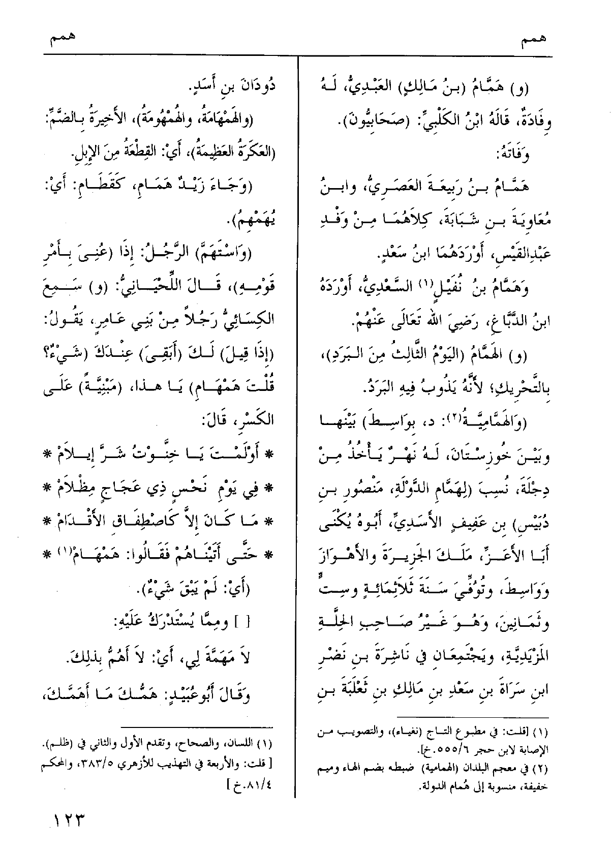 (و) هَمَّامُ (بنُ مَالِكٍ) العَبْدِيُّ، لَهُ وَفَادَةٌ، قالهُ ابنُ الكَلْبِيِّ: (صَحَابِيُّونَ) . وفاتَهُ: هَمَّامُ بنُ رَبِيعَةَ العَصَرِيُّ، وابنُ مُعَاوِيَةَ بنِ شَبَابَةَ، كِلاَهُمَا مِنْ وَفْدِ عَبْدِ القَيْسِ، أَوْرَدَهُمَا ابنُ سَعْدٍ. {وَهَمَّامُ بنُ نُفَيْلٍ السَّعْدِيُّ، أورَدَهُ ابنُ الدَّبَّاغ، رَضِي الله تَعَالَى عَنْهُم. (و) } الهَمَّامُ (اليَوْمُ الثَّالِثُ مِنَ البَرَدِ) ، بِالتَّحْرِيكِ؛ لأنَّهُ يَذُوبُ فِيهِ البَرَدُ. ( {والهَمَّامِيَّةُ: د، بَوَاسِطَ) بَيْنَها وبَيْنَ خُوزِسْتَانَ، لهُ نَهْرٌ يأخُذُ مِنْ دِجْلَةَ، نُسِبَ (} لِهَمَّامِ الدَّوْلَةِ، مَنْصُورِ بنِ دُبَيْسِ) بنِ عَفِيفٍ الأسَدِيِّ، أبُوهُ يُكْنَى أبَا الأَعَزِّ، مَلَكَ الجَزِيرةَ والأَهْوَازَ وَوَاسَطَ، وتُوُفِّيَ سَنَةَ ثَلاثِمَائةٍ وِسِتٍّ وثَمَانِينَ، وَهُوَ غَيْرُ صَاحِبِ الحِلَّةِ المَزْيَدِيَّةِ، ويَجْتَمَعَانِ فِي نَاشِرَةَ بنِ نَضْرِ ابنِ سَرَاةَ بن سَعْدِ بنِ مَالِكِ بن ثَعْلَبَةِ بنِ دُودَانَ بنِ أسَدٍ. ( {والهَمْهَامَةُ،} والهُمْهُومَةُ) ، الأخيرةُ بالضَّمِّ: (العَكَرَةُ العَظِيمَةِ) ، أيْ: القِطْعَةُ منِ الإِبِلِ. (وجَاءَ زَيْدٌ {هَمَامٍ، كَقَطَامِ: أيْ:} يُهَمْهِمُ) . ( {واسْتَهَمَّ) الرَّجُلُ: إذَا (عُنِىَ بِأَمْرِ قَوْمِهِ) ، قالَ: اللحْيَانِيُّ: (و) سَمِعَ الكِسَائِيُّ رَجُلاً مِنْ بَنِي عَامِرٍ: يقولُ: (إذَا قِيلَ) لكَ (أَبْقِىَ) عِنْدَكَ (شَيْءٌ؟ قُلْتَ} هَمْهَامِ) يَا هَذَا، (مَبْنِيَّةً) عَلَى الكَسْرِ، قالَ: