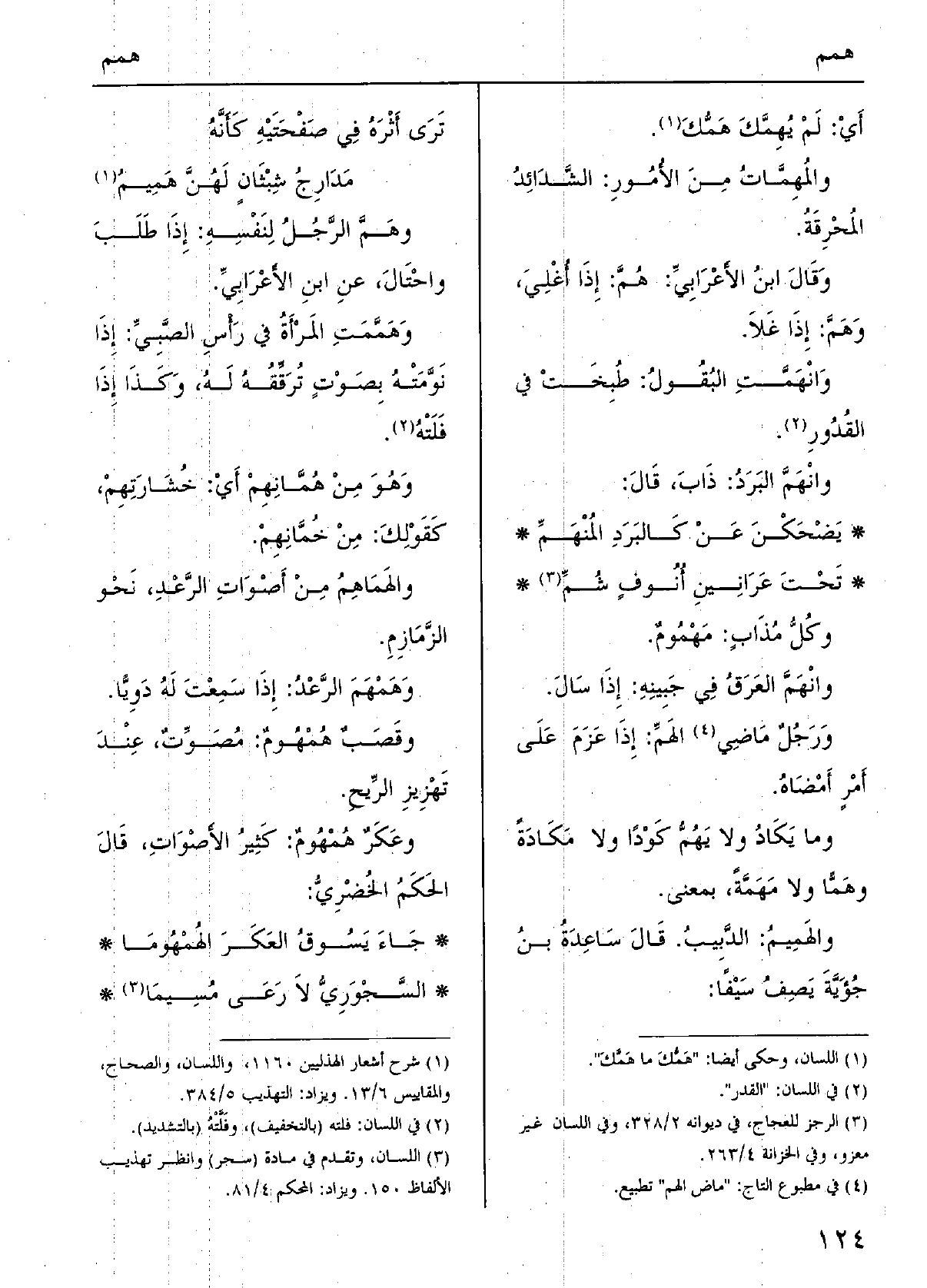 وهَمَّ الرَّجُلُ لِنَفْسهِ: إذَا طَلَبَ واحْتَالَ، عنِ ابنِ الأعْرَابِيِّ.} وهَمَّمَتِ المَرْأةُ فِي رَأْسِ الصَّبِيِّ: إذَا نَوَّمْتْهُ بَصَوْتٍ تُرَقِّقُهُ لَهُ، وَكذَا إذَا فَلَتْهُ. وهوَ مِنْ {هُمَّانِهِمْ أَي: خُشَارَتِهِمْ، كَقَوْلِكَ: مِنْ خُمَّانِهِمْ.} والهَمَاهِمُ مِنْ أَصْوَاتِ الرَّعْدِ، نَحْو الزَّمَازِمِ. {وهَمْهَمَ الرَّعْدُ: إِذا سَمِعْتَ لَهُ دَوِيًّا. وقَصَبٌ} هُمْهُومٌ: مُصَوِّتٌ، عِنْدَ تَهْزِيزِ الرِّيحِ. وعَكَرٌ هُمْهُومٌ: كَثِيرُ الأصْواتِ، قالَ الحَكَمُ الخُضْرِيُّ