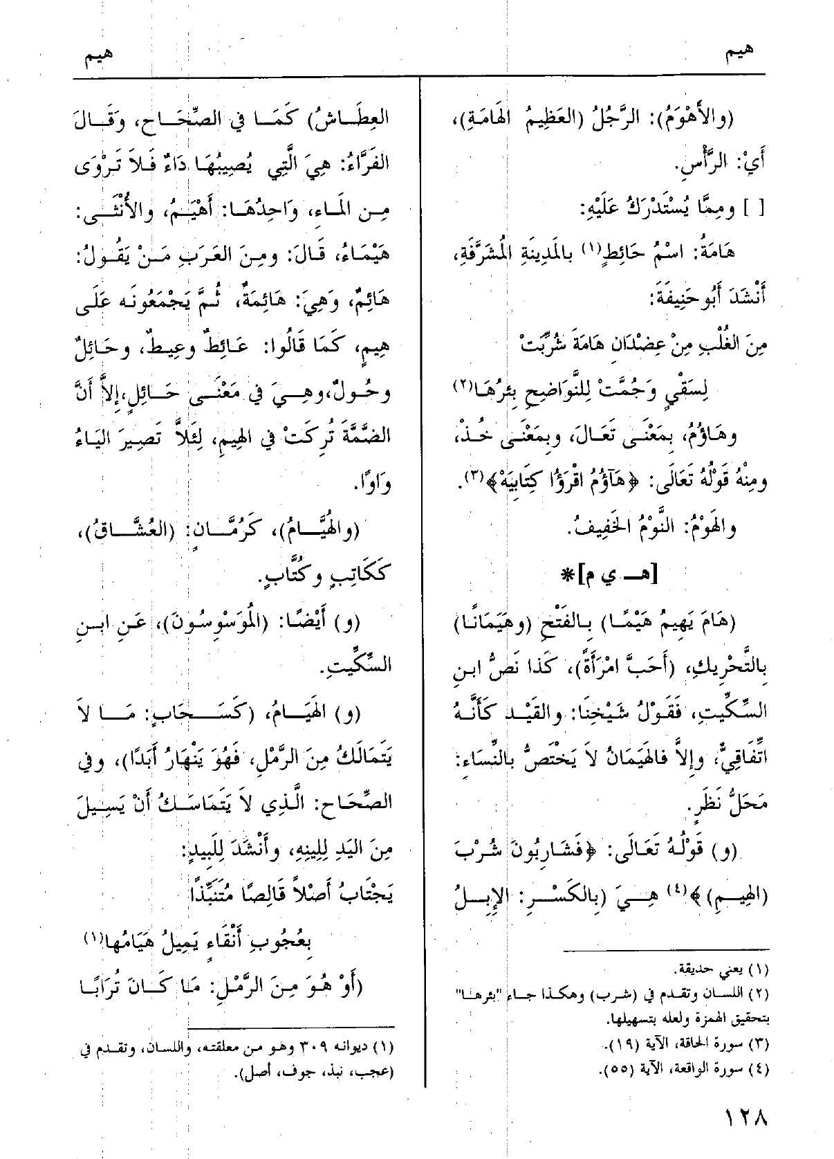 ( {هَامَ} يَهِيمُ {هَيْمًا) بِالفَتْحِ (} وهَيَمَاناً) بِالتَحْرِيكِ، (أحَبَّ امْرَأَةً) ، كَذَا نَصُّ ابنِ السِّكِّيتِ، فقَوْلُ شيْخِنَا: والقَيْد كَأنَّهُ اتِّفَاقِيٌّ، وإلاَّ {فالهَيَمَانُ لَا يَخْتَصُّ بالنِّسَاءِ: مَحَلُّ نَظَرٍ. (و) قَوْلُهُ تَعَالَى: {فَشَارِبُونَ شَرْبَ (} الهِيمِ} هِيَ (بالكَسْرِ: الإِبِلُ العِطَاشُ) كَمَا فِي الصِّحَاح، وقَالَ الفَرَّاءُ: هِيَ التِي يُصِيبُها دَاءٌ فَلَا تَرْوَى مِن المَاءِ، وَاحِدُهَا: {أَهْيَمُ، والأُنْثَى:} هَيْمَاءُ، قالَ: ومِنَ العَرَبِ مَنْ يَقُولُ: {هَائِمٌ، وهيَ:} هَائِمَةٌ، ثمَّ يَجْمَعُونَه عَلَى هِيمٍ، كَمَا قَالُوا: عَائِطٌ وعِيطٌ، وحَائِلٌ وحُولٌ، وهيَ فِي مَعْنَى حَائِلٍ، إلاَّ أنَّ الضَّمَّةَ تُرِكَتْ فِي الهِيمِ، لئلاَّ تَصِيرَ اليَاءُ وَاوًا. ( {والهُيَّامُ) ، كَرُمَّان (العُشَّاقُ) ، كَكَاتِبٍ وكُتَّابٍ. (و) أَيْضًا: (المُوَسْوِسُونَ) ، عنِ ابنِ السِّكِّيتِ. (و) } الهَيَامُ، (كَسَحَابٍ: مَا لاَ يَتَمَالَكُ مِنَ الرَّمْلِ، فهُوَ يَنْهَارُ أَبَدًا) ، وَفِي الصِّحَاح: الذِي لَا يَتَمَاسَكُ أنْ يَسِيلَ مِنَ اليَدِ لِلِينِهِ، وأَنْشدَ لِلبِيدٍ: