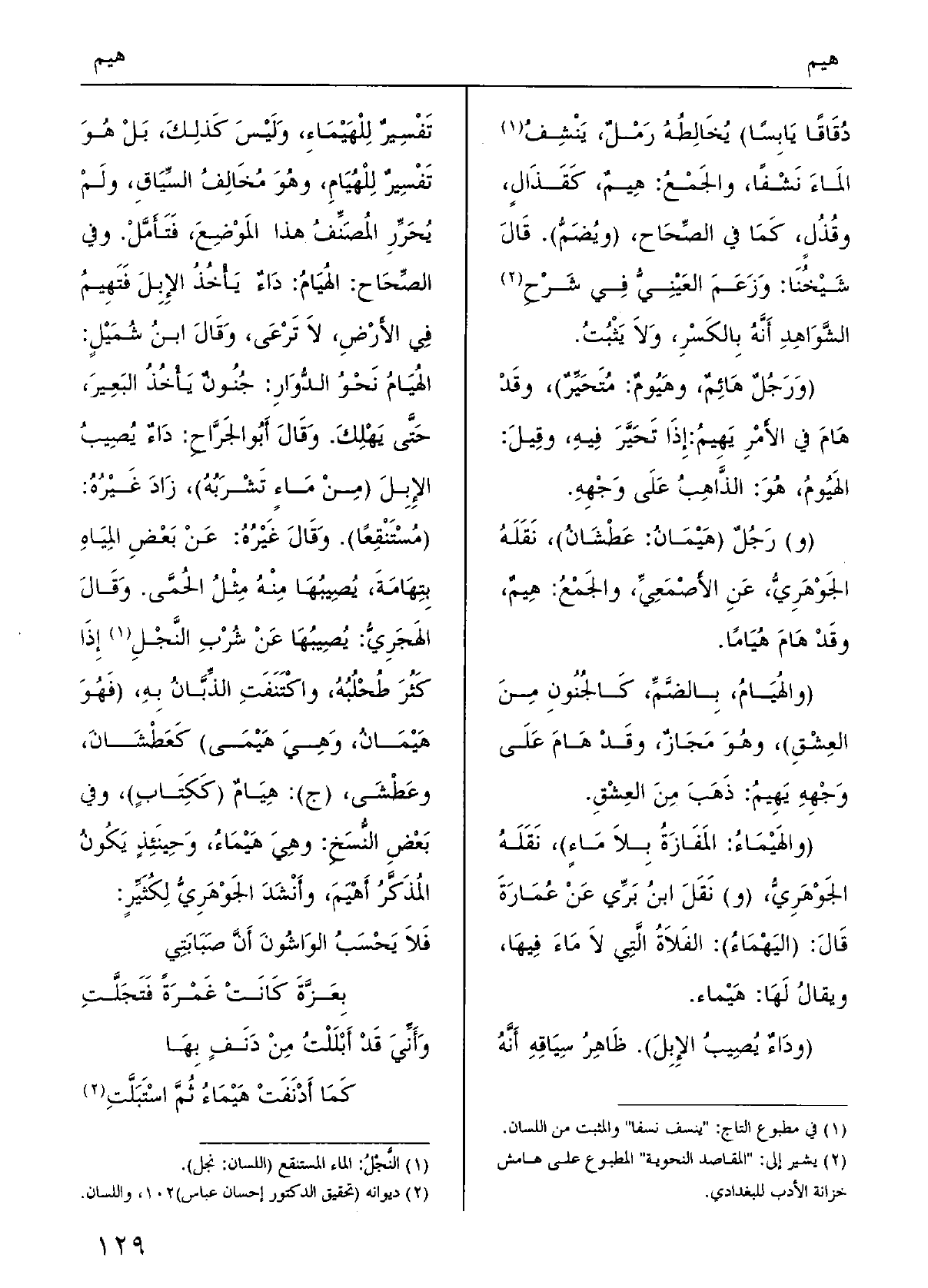دُقَاقاً يَابِسًا) يُخالِطُهُ رَمْلٌ، يَنْشِفُ الماءَ نَشْفًا، والجَمْعُ: {هِيمٌ، كَقَذَالٍ، وقُذُل، كَمَا فِي الصِّحَاح، (ويُضَمُّ) . قالَ شيخُنا: وَزَعَمَ العَيْنِيُّ فِي شَرْحِ الشَّوَاهدِ أنَّهُ بِالكَسْرِ، ولاَ يَثْبُتُ. (ورَجُلٌ هَائِمٌ،} وهَيُومٌ: مُتَحَيِّرٌ) ، وقدْ هَامَ فِي الأمْرِ يَهِيمُ: إِذا تَحَيَّرَ فِيهِ، وقيلَ: {الهَيُومُ: هُوَ: الذَّاهِبُ عَلَى وَجْهِهِ. (و) رَجُلٌ (} هَيْمَانُ: عَطْشَانُ) ، نَقَلَهُ الجَوْهَرِيُّ، عَنِ الأَصْمَعِيِّ، والجَمْعُ: هِيمٌ، وقدَ هَامَ {هُيَامًا. (} والهُيَامُ، بالضَّمِّ، كالجُنُونِ منَ العِشْقِ) ، وَهُوَ مَجَازٌ، وقدْ هَامَ علَى وجْهِهِ يَهِيمُ: ذَهَبَ مِنَ العِشْقِ. ( {والهَيْمَاءُ: المَفَازَةُ بِلاَ مَاءٍ) ، نَقَلَهُ الجَوْهَرِيُّ، (و) نَقَلَ ابنُ برِّي عنْ عُمَارَةَ قالَ: (اليَهْمَاءُ) الفَلاَةُ التِي لاَ مَاءَ فِيهَا، ويقالُ لَهَا:} هَيْماء. (ودَاءٌ يُصِيبُ الإِبِلِ) . ظاهِرُ سِياقِهِ أنَّهُ تَفْسِيرٌ {للهَيْمَاء، ولَيْسَ كَذلِكِ، بلْ هُوَ تَفْسِيرٌ} للْهُيَامِ، وَهُوَ مُخَالِفُ السِّيَاقِ، ولَمْ يُحَرِّرِ المُصَنِّفُ هَذَا المَوْضِعَ، فَتَأَمَّلْ. وَفِي الصِّحَاح: {الهُيَامُ: داءٌ يَأْخُذُ الإبِلَ فَتَهِيمُ فِي الأَرْضِ، لَا تَرْعَى، وقالَ ابنُ شُمَيْل: الهُيَامُ نَحْوُ الدُّوَارِ: جُنُونٌ يَأْخُذُ البَعِيرَ، حَتَّى يَهْلِك. وقالَ أَبُو الجَرَّاحِ: داءٌ يُصِيبُ الإِبِلَ (منْ ماءٍ تَشْرَبُهُ) . زَادَ غَيْرُهُ: (مُسْتَنْقِعًا) . وَقَالَ غَيْرُهُ: عنْ بعضِ المِياهِ بِتِهَامَةَ، يُصِيبُهَا مِنْهُ مِثْلُ الحُمَّى. وقالَ الهَجَرِيّ: يُصِيبُهَا عَنْ شُرْبِ النَّجْلِ إِذَا كَثُرَ طُحْلُبُهُ، واكْتَنَفَتِ الذِّبَّانُ بِهِ، (فهُوَ} هَيْمَانُ، وَهِيَ {هَيْمَى) كَعَطْشَانَ، وعَطْشَى، (ج) :} هِيَامٌ (كَكِتَابٍ) ، وَفِي بعضِ النُّسَخِ: وهيَ هَيْمَاءُ، وَحينئِذٍ يَكُونُ المُذَكَّرُ! أَهْيَمَ، وأنْشَدَ الجَوْهَرِيُّ لِكُثَيِّرٍ: